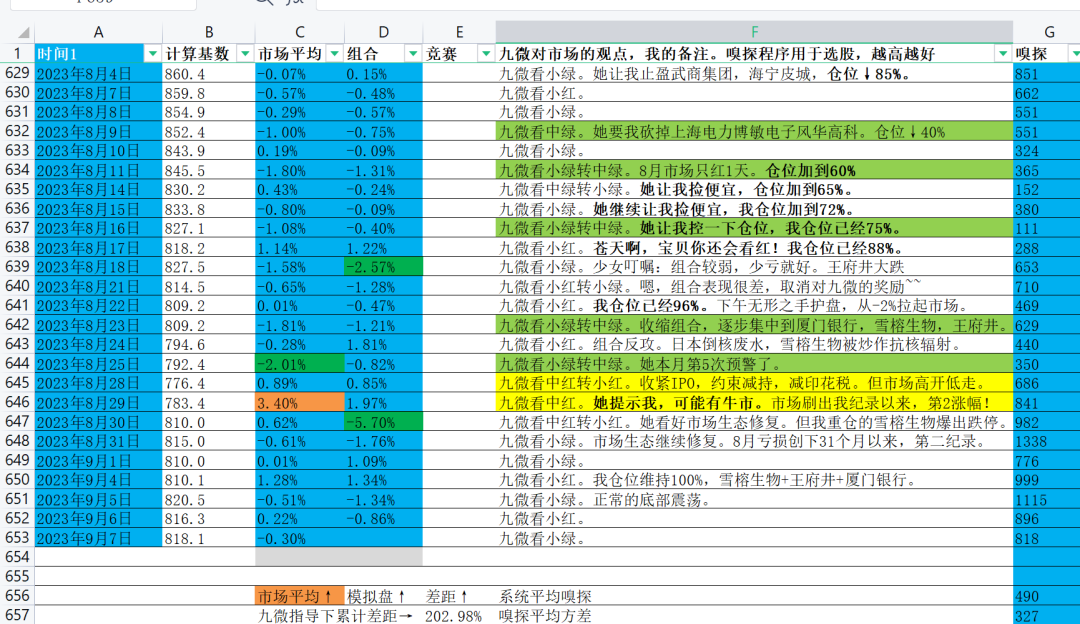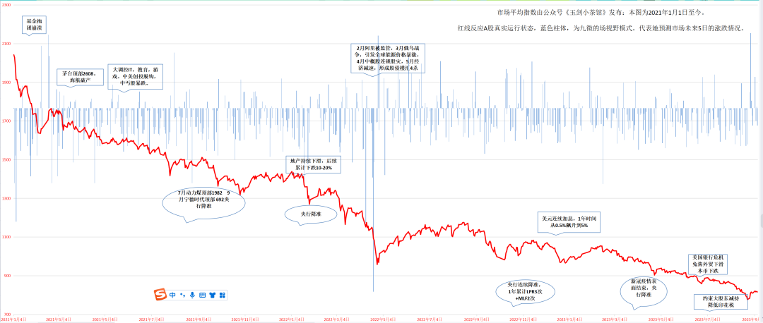 假设2021年1月1日,市场最初价格水平为2021。在第1个交易日,记录深圳市场涨跌排名(第1200名附近)为1.03%。则市场变化为=2021*(1+1.03%)=2042,连接为红线。蓝色柱体,为九微的场视野模式。代表她预测市场未来5日的涨跌情况。22年9月,由于IPO激增,将数据改为深圳市场涨跌排名1300名。
