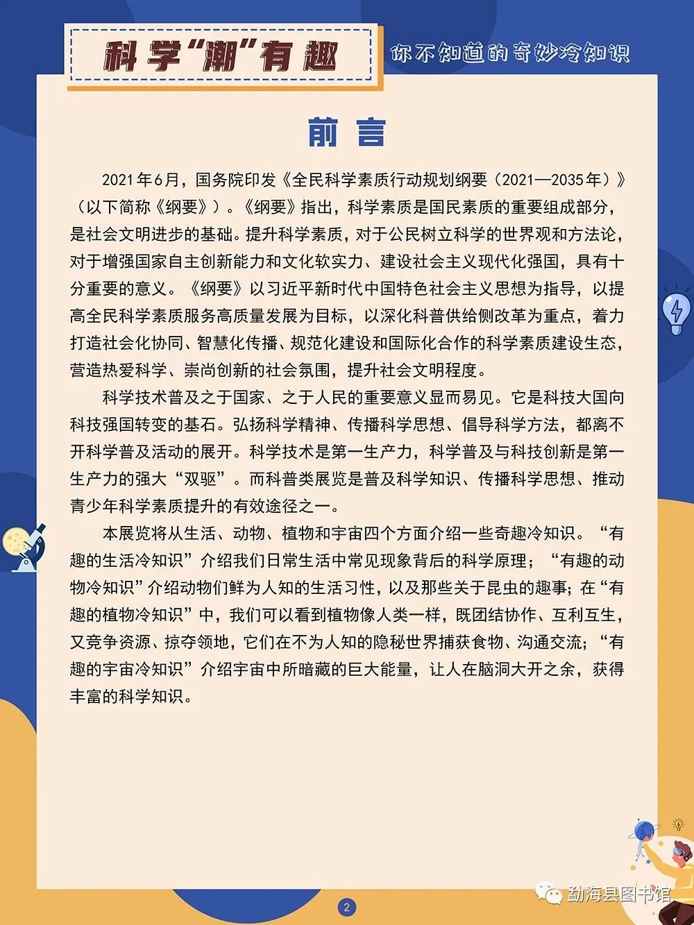 科普类展览是普及科学知识、传播科学思想、推动青少年科学素质提升的有效途径之一。本展览将从生活、动物、植物和宇宙四个方面介绍一些奇趣冷知识。“有趣的生活冷知识”介绍我们日常生活中常见现象背后的科学原理;“有趣的动物冷知识”介绍动物们鲜为人知的生活习性,以及那些关于昆虫的趣事;在“有趣的植物冷知识”中,我们可以看到植物像人类一样,既团结协作、互利互生,又竞争资源、掠夺领地,它们在不为人知的隐秘世界捕获食物、沟通交流;“有趣的宇宙冷知识”介绍宇宙中所暗藏的巨大能量,让人在脑洞大开之余,获得丰富的科学知识。