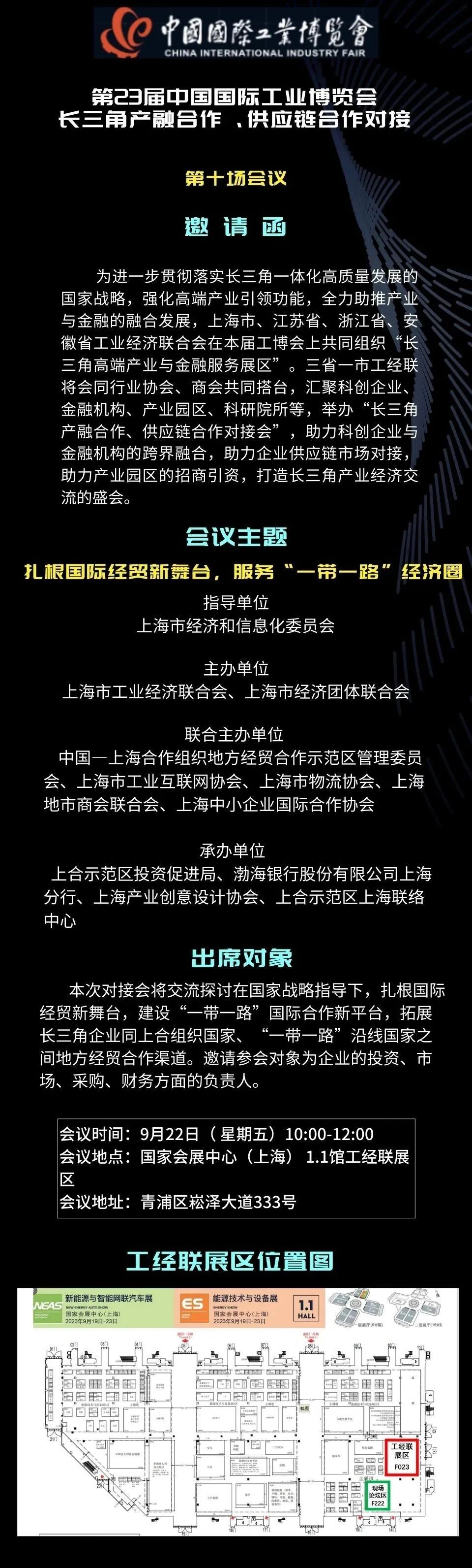 第23届中国国际工业博览会第十场会议将于9月22日(星期五)在国家会展中心(上海)1.1馆工经联展区召开。商会邀约会员企业参加,感谢支持!邀约企业(投资、市场、采购、财务等人员)参会,感谢支持!