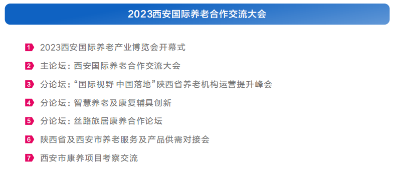 为促进打造符合国家中心城市定位、居于全国中上水平、具有西安特色的养老服务样板”这一奋斗目标,西安市人民政府联合陕西省民政厅、中国老年医学学会主办2023西安国际养老产业博览会,同期举办西安国际养老合作交流大会,全面推进养老产业的高质量发展,不断满足人民日益增长的美好生活需求。