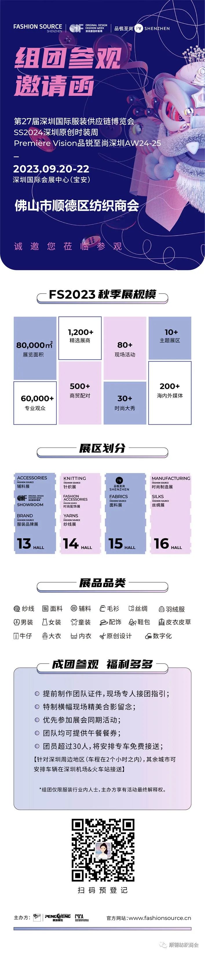 第27届FASHION SOURCE深圳国际服装供应链博览会将于9月底在深圳国际会展中心举行。FS作为时尚供应链的国际引领者,是国内外服装供应链上下游企业展示企业新品和获取订单的最佳机会。我商会将在9月21日组织会员企业参观本次博览会,超过30人报名成团商会将安排大巴接送(集中乘车地点另行通知)。现将活动安排通知如下: