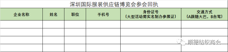 (备注:回执表可根据企业需求增减行数或自制。展会需实名制办理参展证,没有提供身份证号码的参展人员,可持身份证到展会现场直接办理。)
