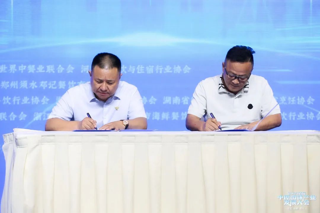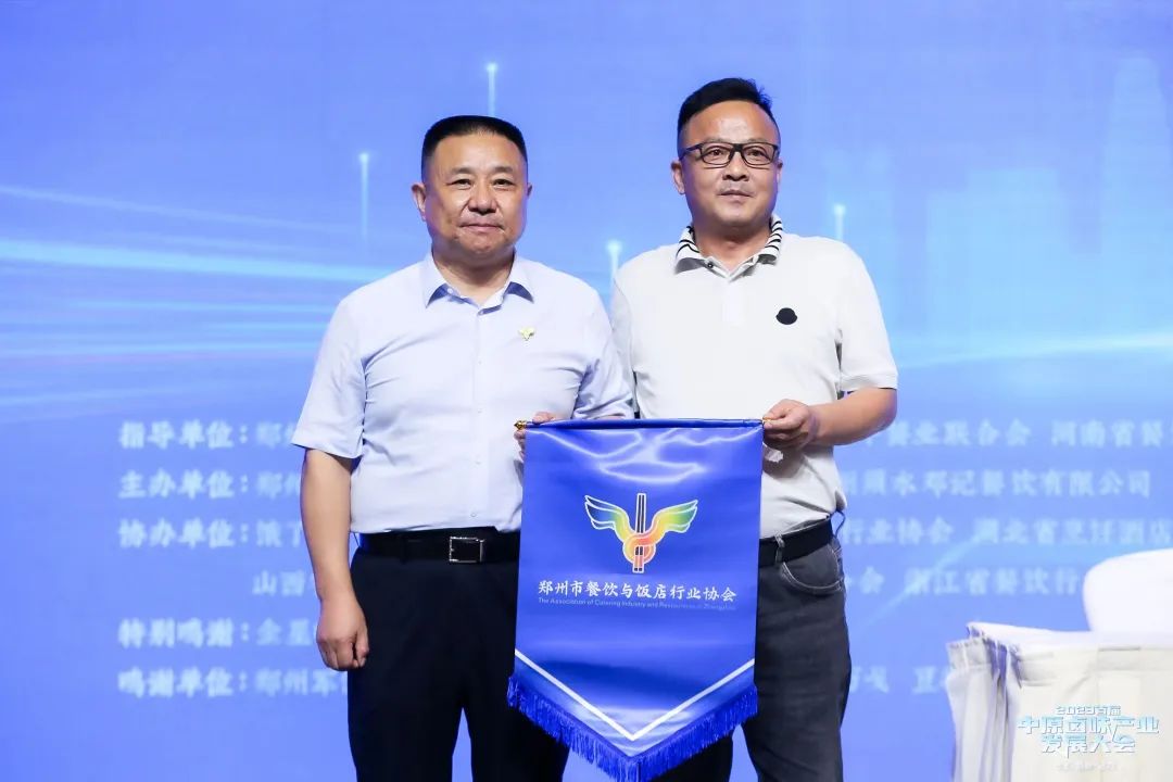 主办方郑州市餐饮与饭店行业协会与三亚市餐饮行业协会签订友好协会战略协议,并送上郑州餐协会旗。