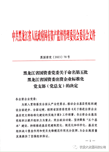 近日,黑龙江省国资委党委印发《关于命名第五批黑龙江省国资委出资企业标准化党支部(党总支)的决定》(黑国资党〔2023〕70号),黑龙江农投大数据科技有限公司党支部在黑龙江省国资委出资的众多企业中脱颖而出,荣获“黑龙江省国资委出资企业标准化党支部”称号,建设标准化党支部是推动全面从严治党向基层延伸的有效载体,有利于强化党支部的凝聚力和战斗力,进一步发挥党员先锋模范作用。