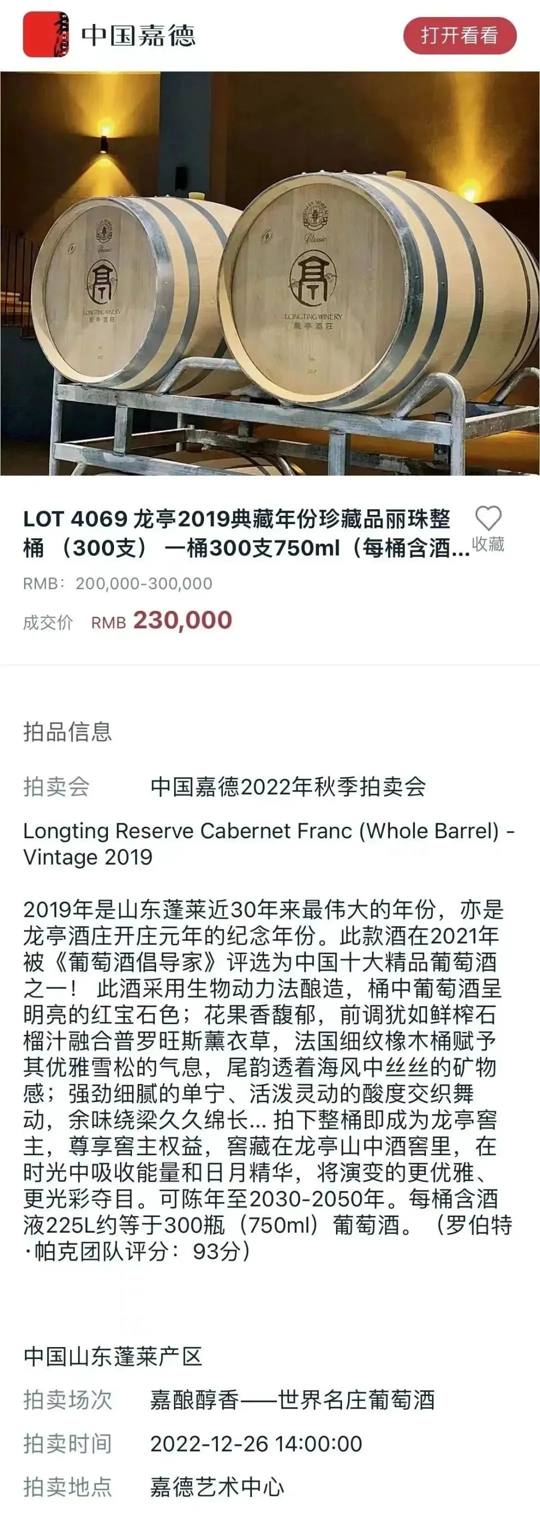 2022年12月26日,龙亭酒庄珍藏品丽珠红葡萄酒2019年份(整桶限量版)压轴登上嘉德秋拍,成为了登上嘉德国际拍卖的首个中国葡萄酒品牌,也是中国葡萄酒首次以整桶的形式进入拍卖市场。