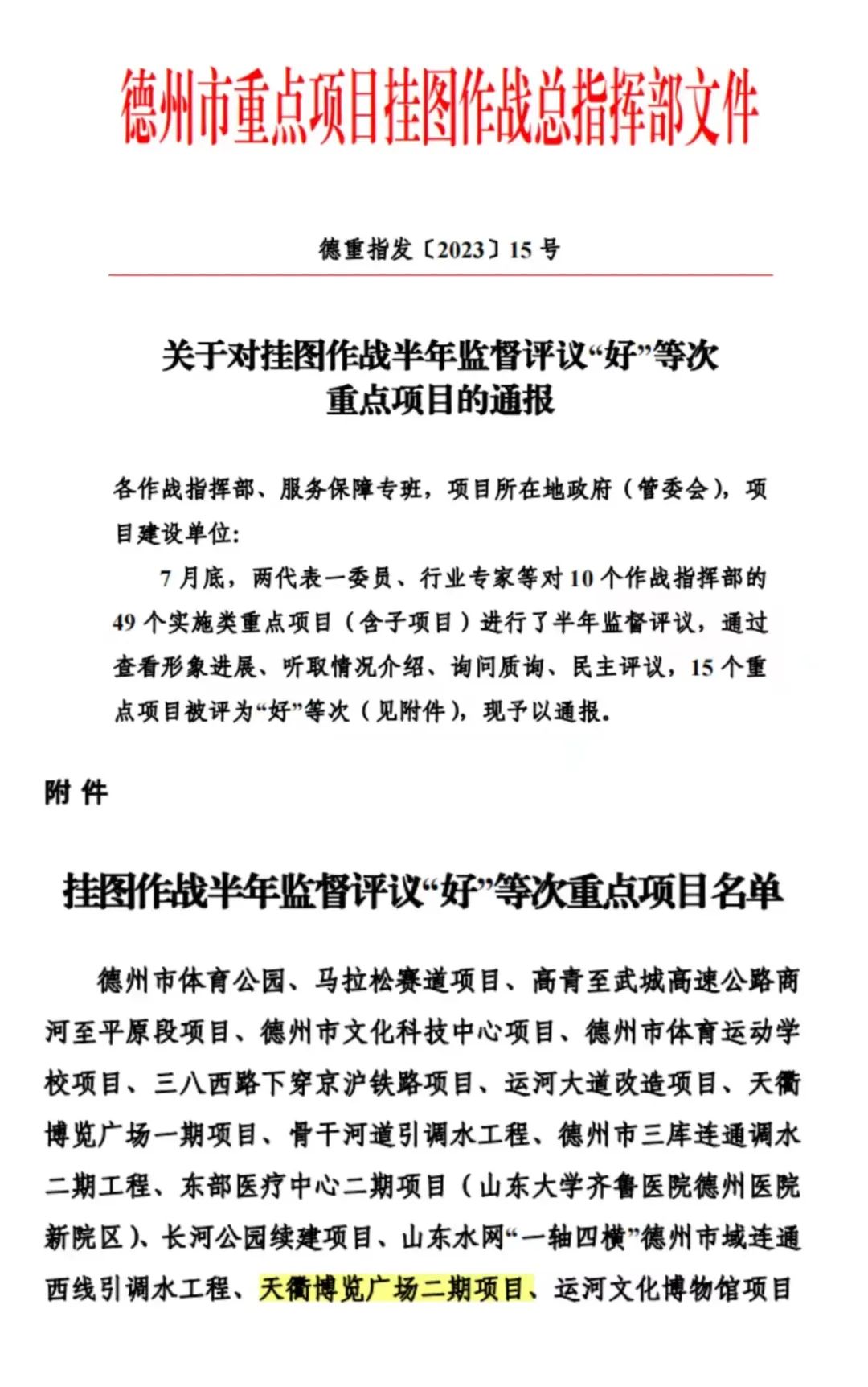 近日,德州市重点项目挂图作战总指挥部公布了挂图作战半年监督评议“好”等次重点项目名单,交投集团天衢博览广场二期项目(德州市低碳绿色新能源示范产业园区基础设施建设项目)光荣上榜。
