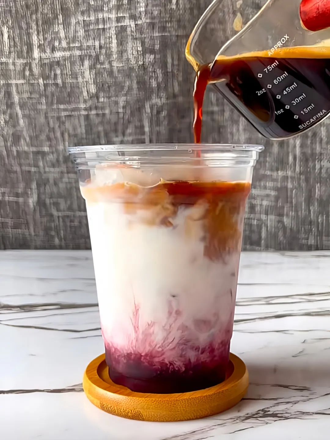 2.加入100ml牛奶,最后加入一小杯浓缩咖啡液体,三者融合,拿铁酒精版诞生