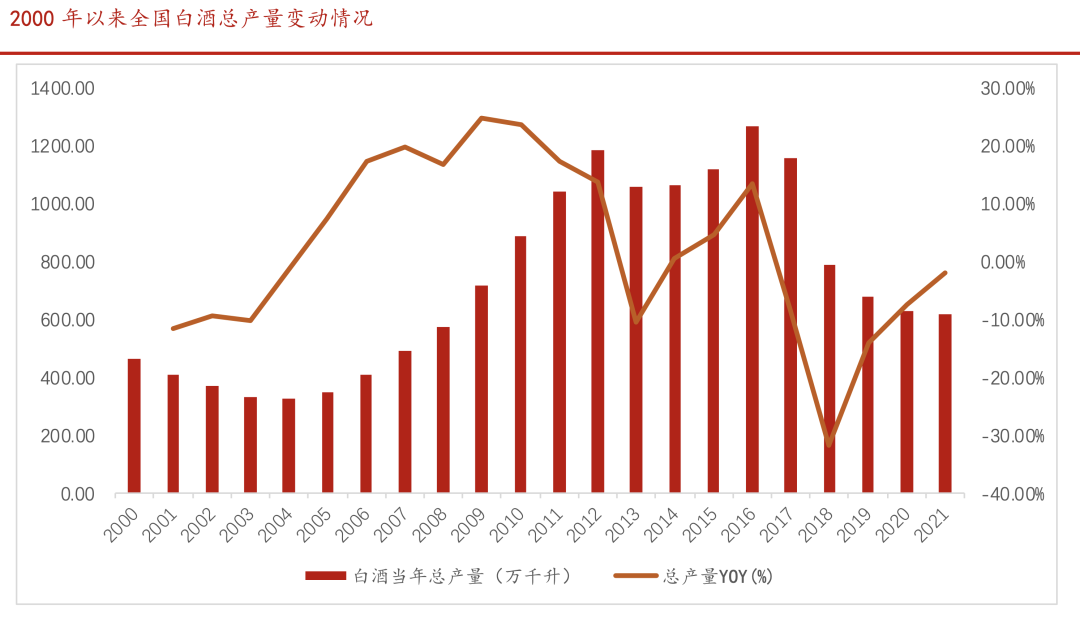 第一阶段(2000年-2012年):这个阶段中国经济的GDP增速平均为9.6%。受益于宏观经济快速发展,城乡居民收入快步增长,白酒需求量的不断上升,白酒产销量持续高速增长,白酒行业呈现出供需两旺的发展情况。在这一时期,除了2008金融危机导致短暂的增速下滑,大部分时间都维持了高速增长。全国性白酒品牌和地方区域性名酒企业均获得了快速发展。