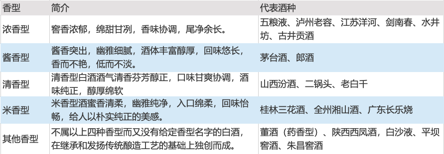 A股流行这样的一句话:“中国只有两种科技,一种是酱香型科技,一种是浓香型科技”。这两种“科技”就是白酒最主要的两种口味,除此之外,还有清香、米香、药香等口味的白酒。如下所示: