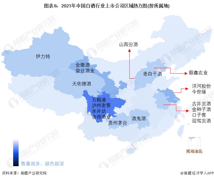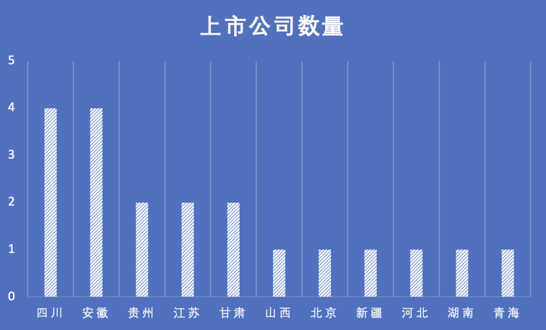 当前上市的20个白酒企业分布在全国11个省市,四川省和安徽省是上市白酒企业最多的省份。