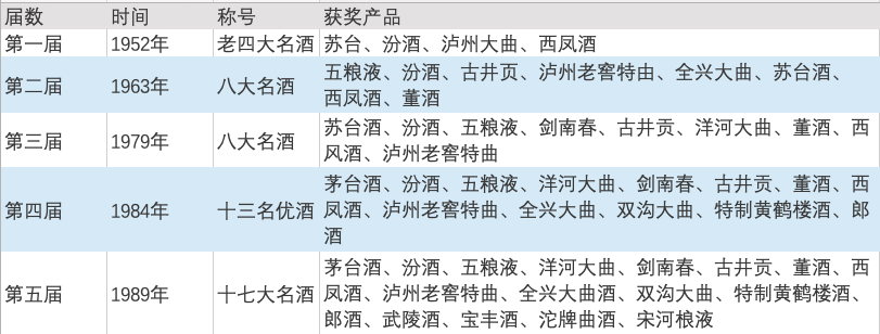 新中国成立后,我国对白酒进行过5次国际级评比。茅台酒、汾酒、泸州老窖特曲在历次国家评酒会上均被评为名酒,五粮液、西凤酒、董酒、古井贡酒4次入选,剑南春则3次入选。此后,这8种酒一起成为了约定俗成的“中国八大名酒”。