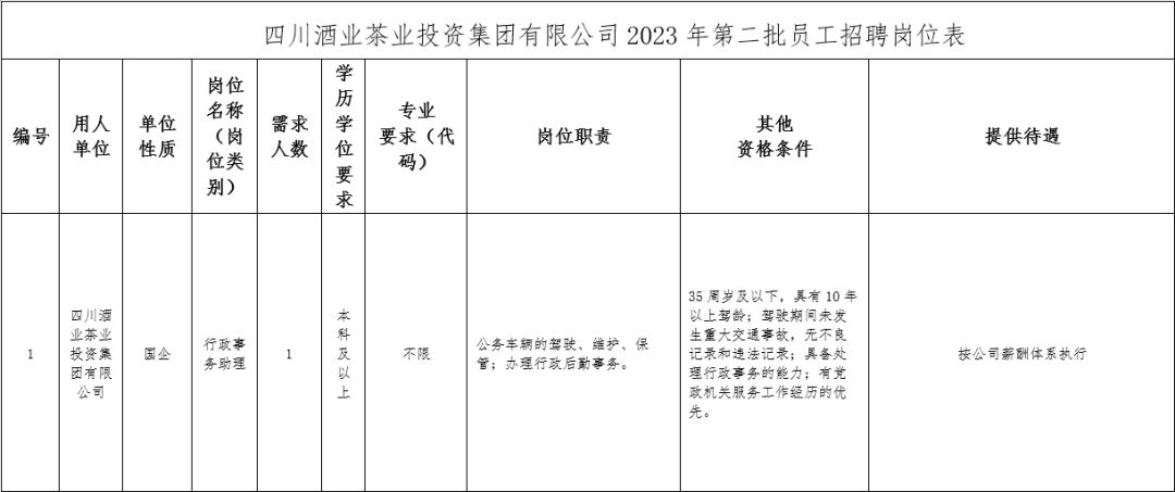 受宜宾市国有企业人力资源中心委托,宜宾人才发展集团有限公司按照公开、平等、竞争、择优的原则,面向社会公开为四川酒业茶业投资集团有限公司招聘4名工作人员。现将有关事项公告如下: