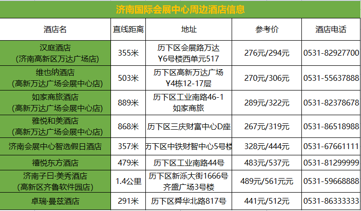 9月份是济南的旅游旺季,如需住宿请提前预定酒店,组委会为您推荐展馆附近酒店如下,请参考。
