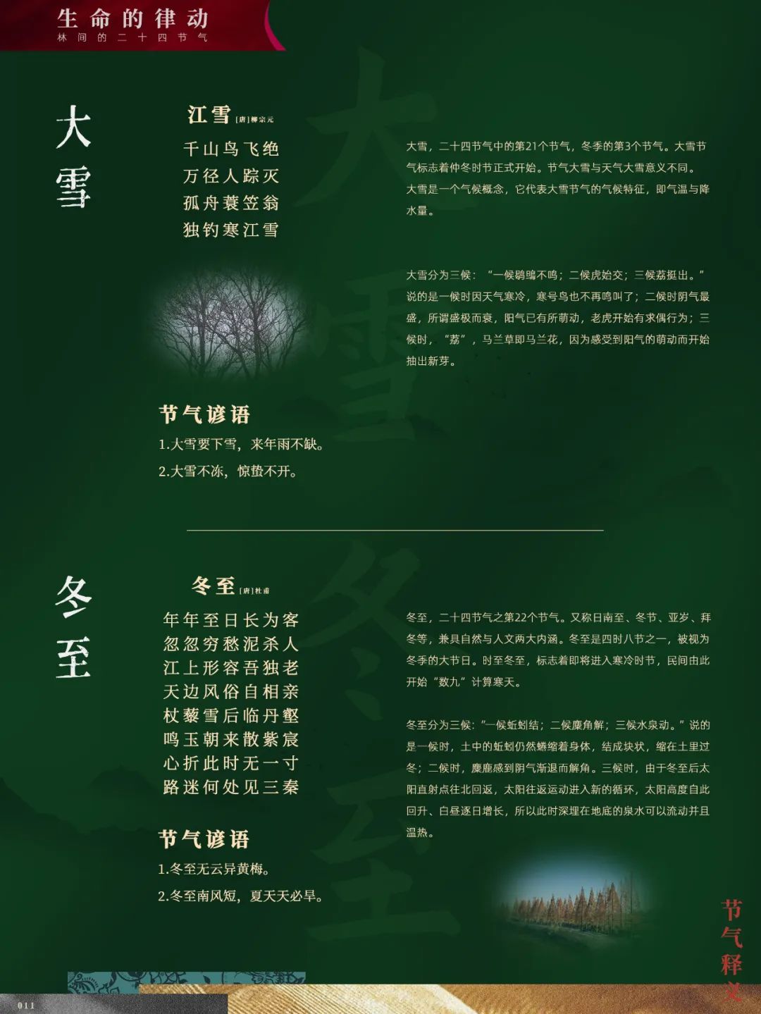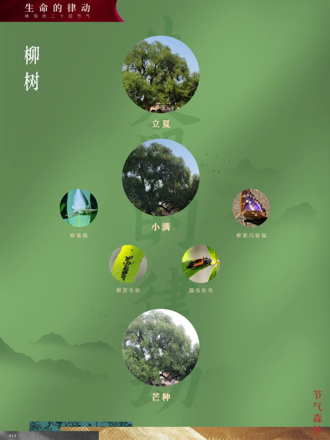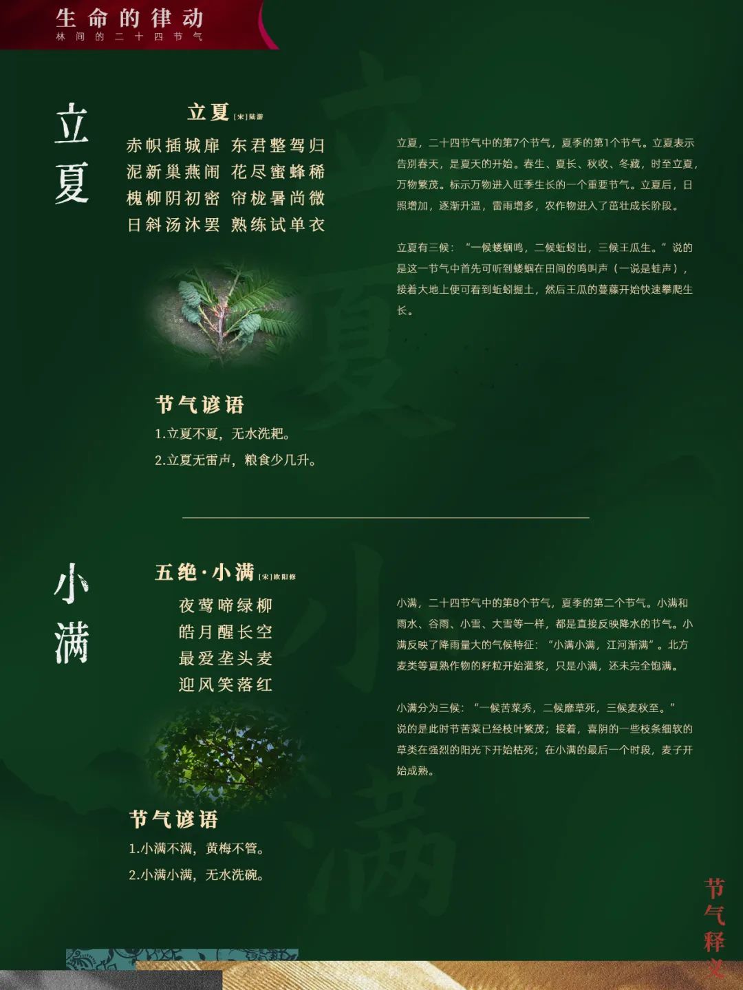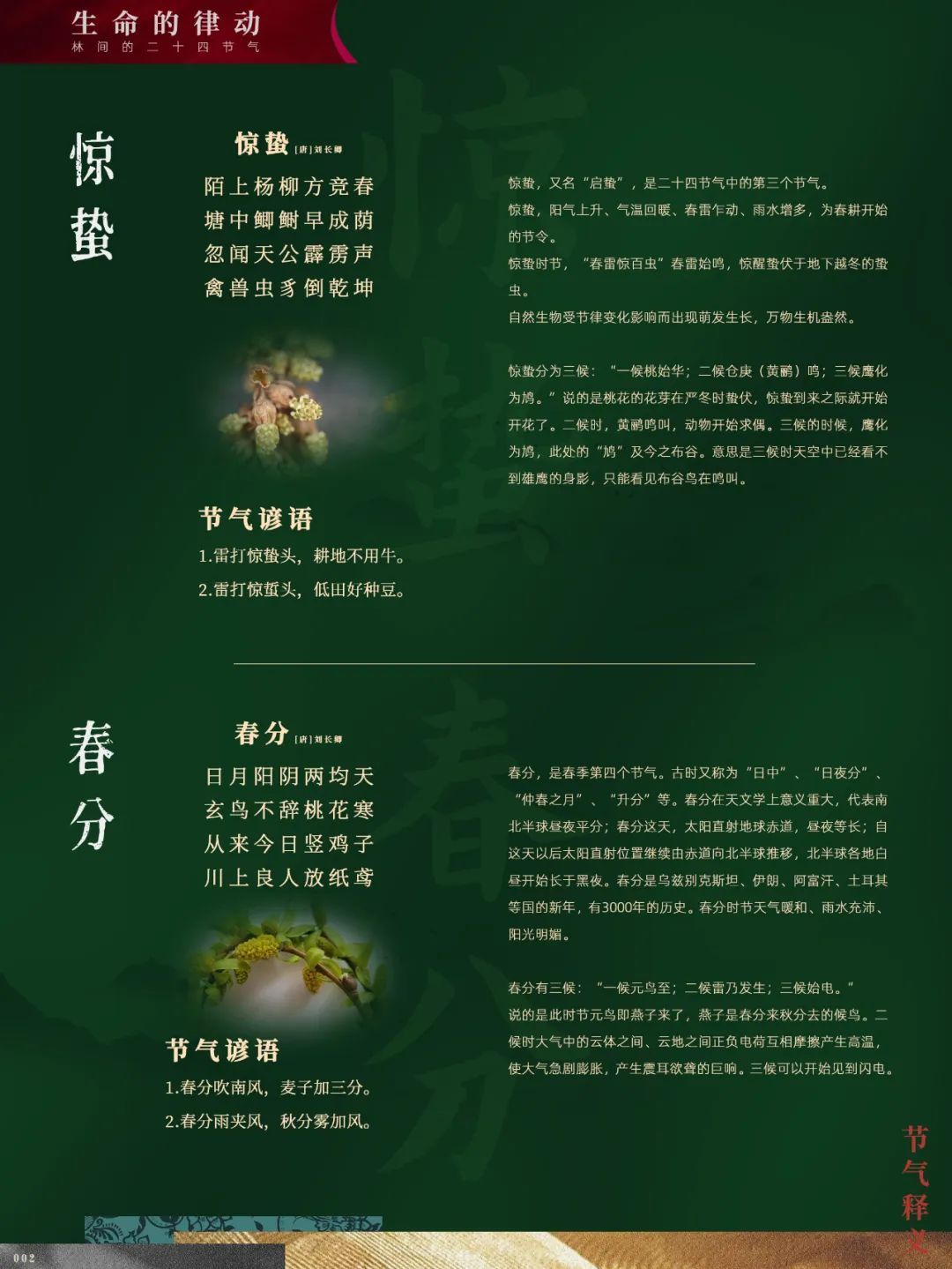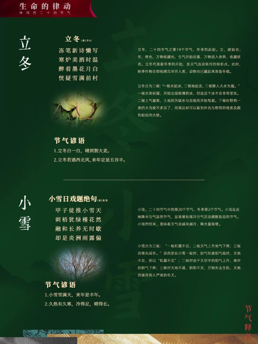 二十四节气是中国人诗意栖居的创造,是上古先民顺应农时,通过观察天体运行,认知一岁中时令、气候、物候等变化规律所形成的知识体系,蕴含着悠久的文化内涵和历史积淀,是中华民族悠久历史文化的重要组成部分。展览带我们亲近自然,从节气释义、节气森林、节气游戏等版块展现树木在二十四个节气中循环律动的过程,展现中国传统文化的智慧以及自然界勃勃的生命力。