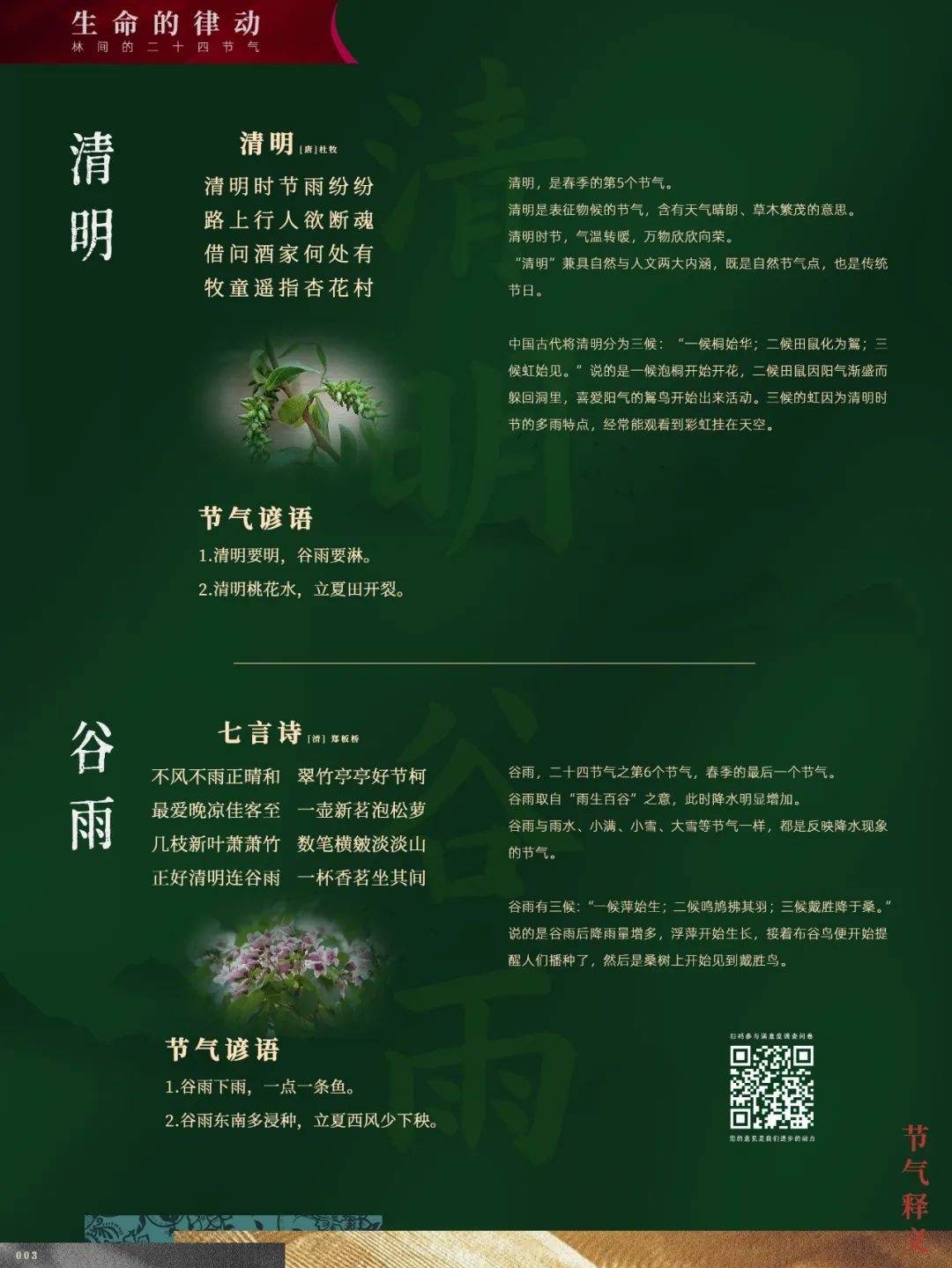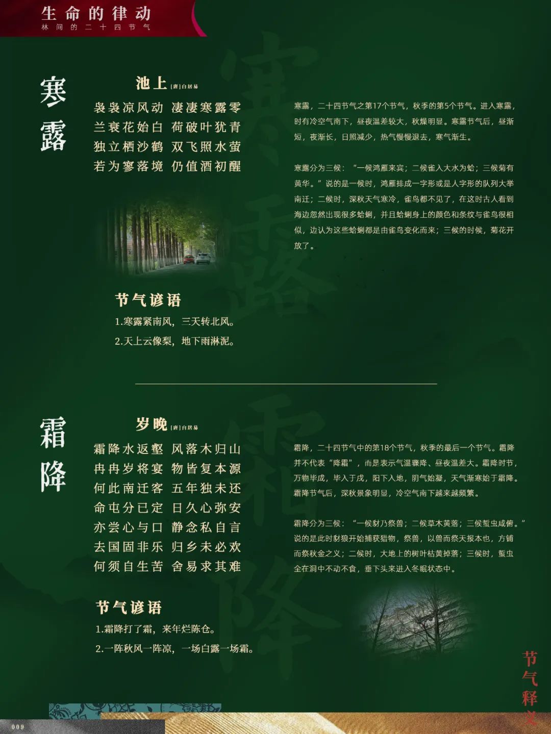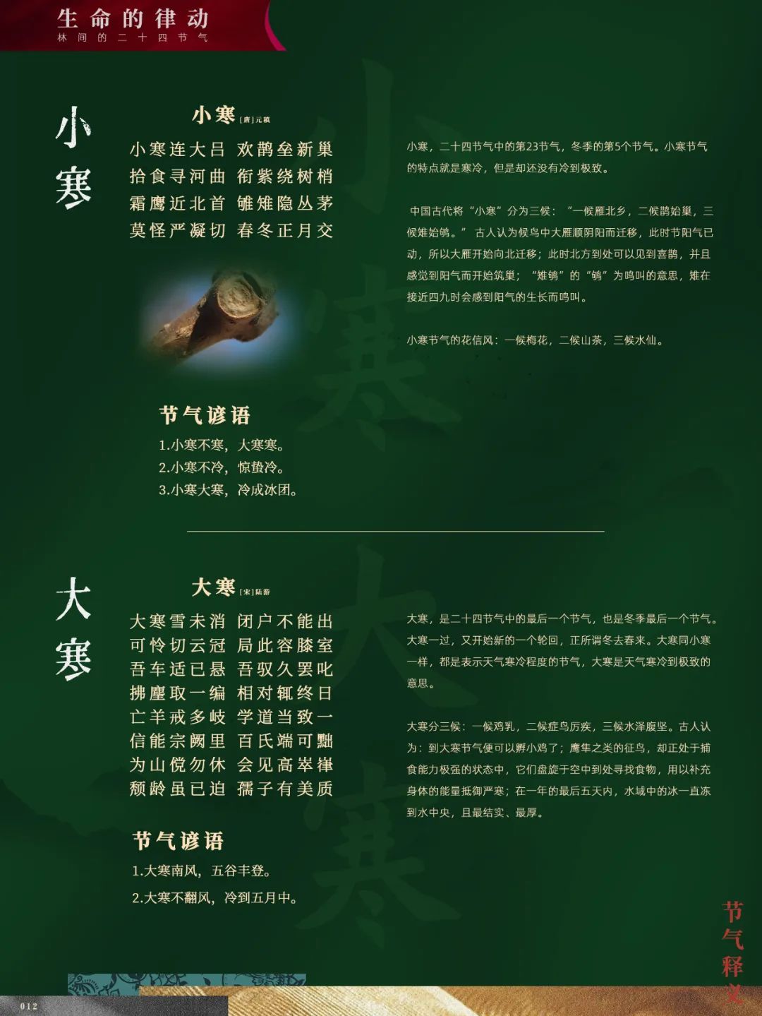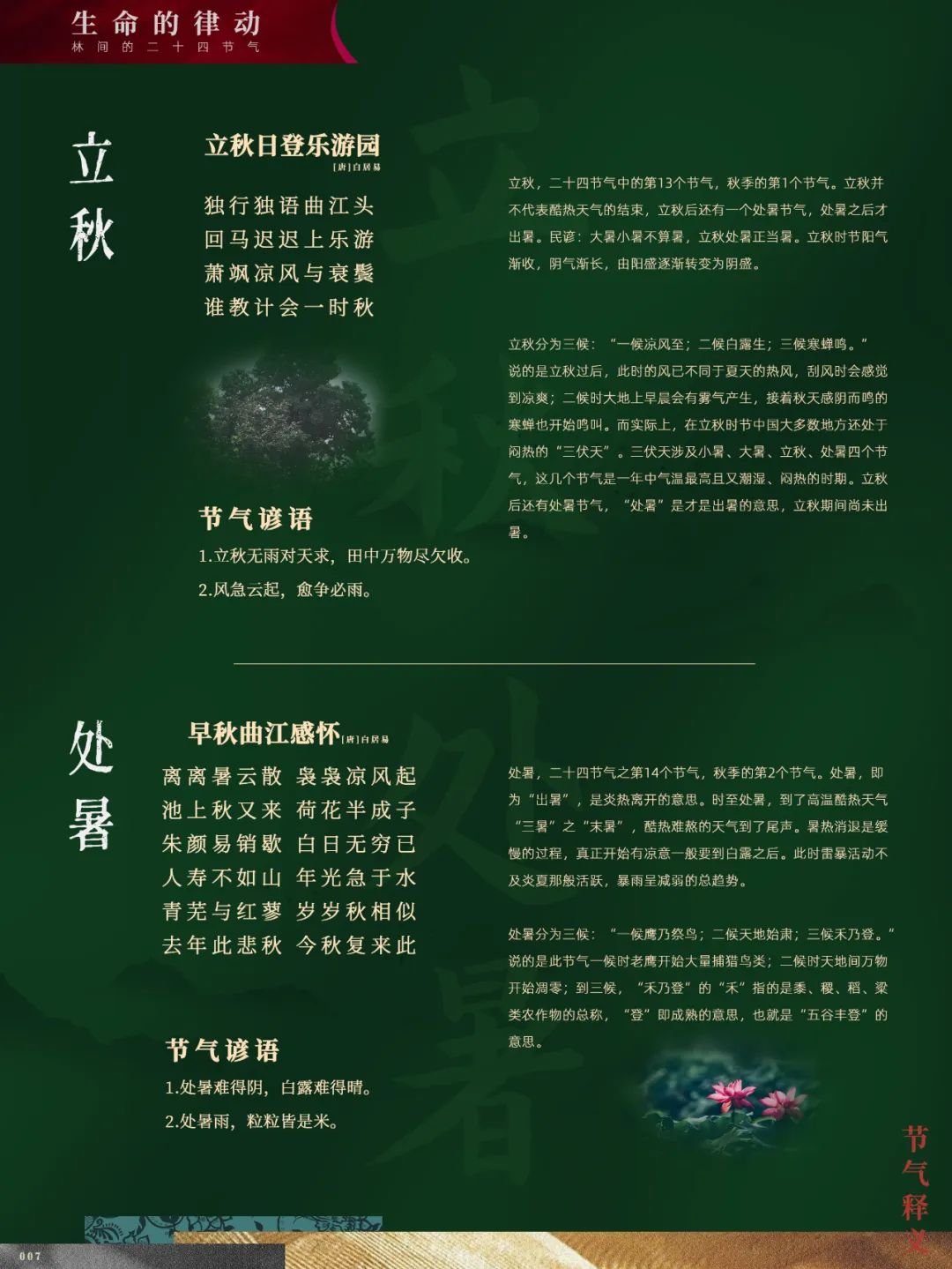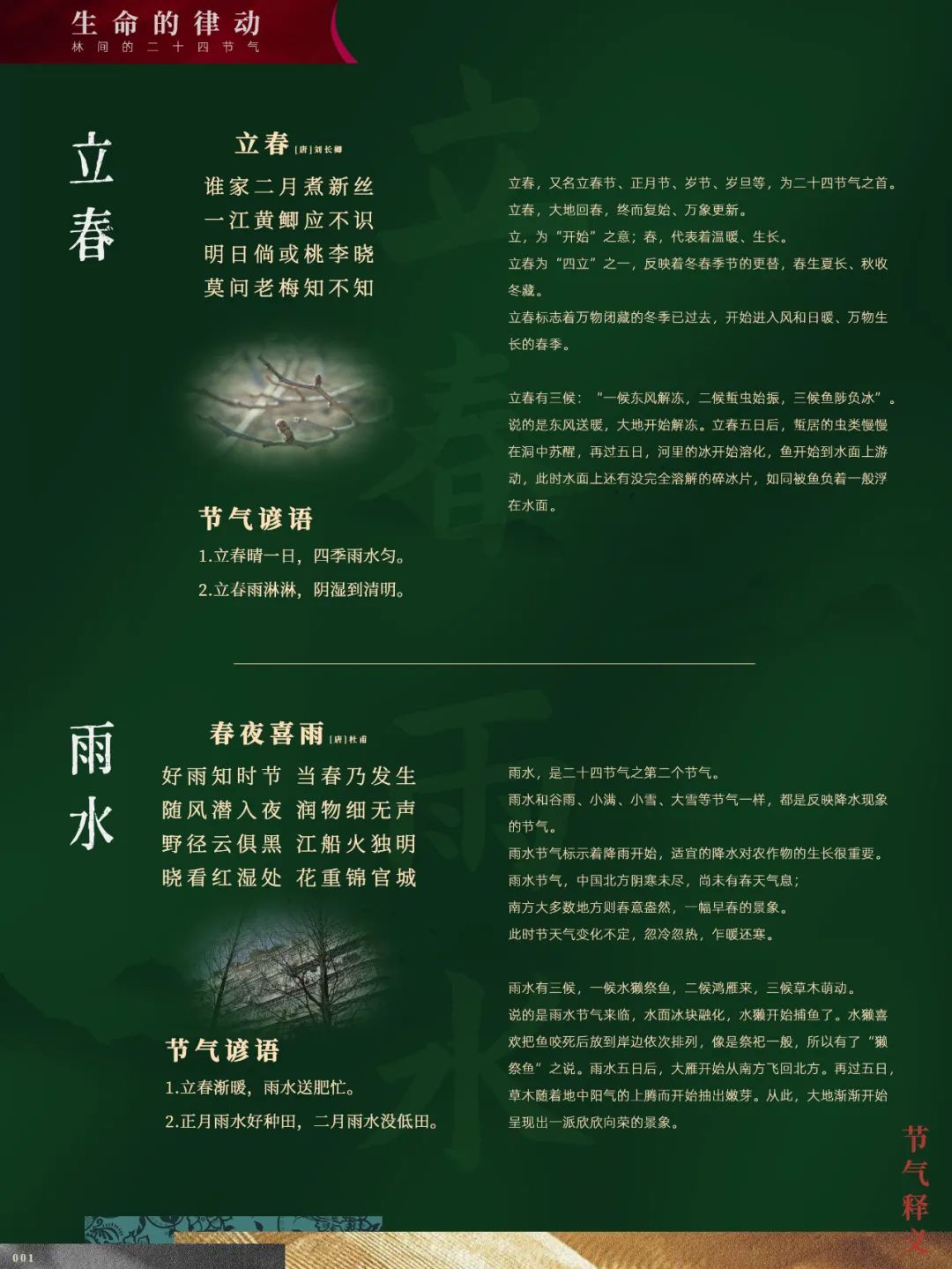 二十四节气是中国人诗意栖居的创造,是上古先民顺应农时,通过观察天体运行,认知一岁中时令、气候、物候等变化规律所形成的知识体系,蕴含着悠久的文化内涵和历史积淀,是中华民族悠久历史文化的重要组成部分。展览带我们亲近自然,从节气释义、节气森林、节气游戏等版块展现树木在二十四个节气中循环律动的过程,展现中国传统文化的智慧以及自然界勃勃的生命力。