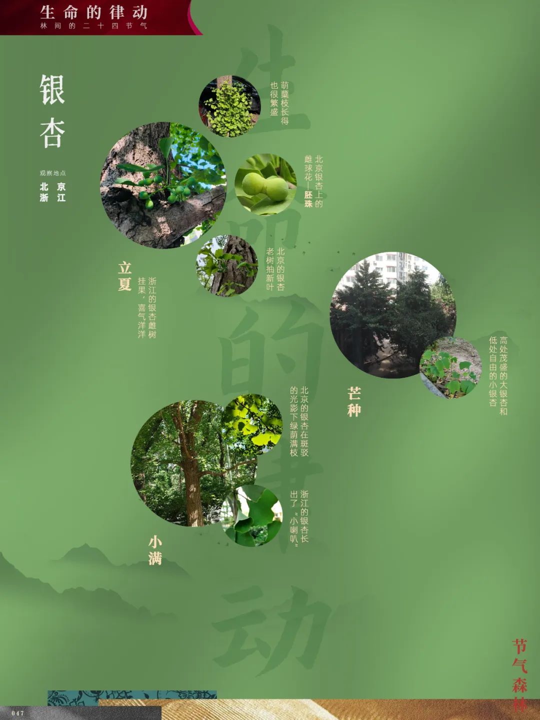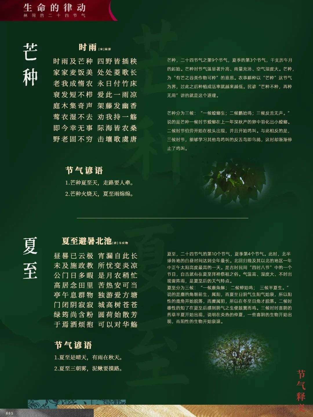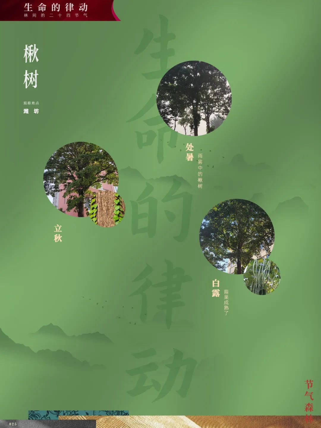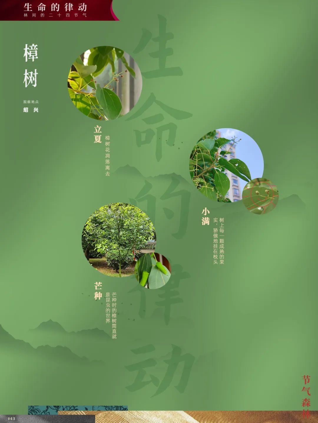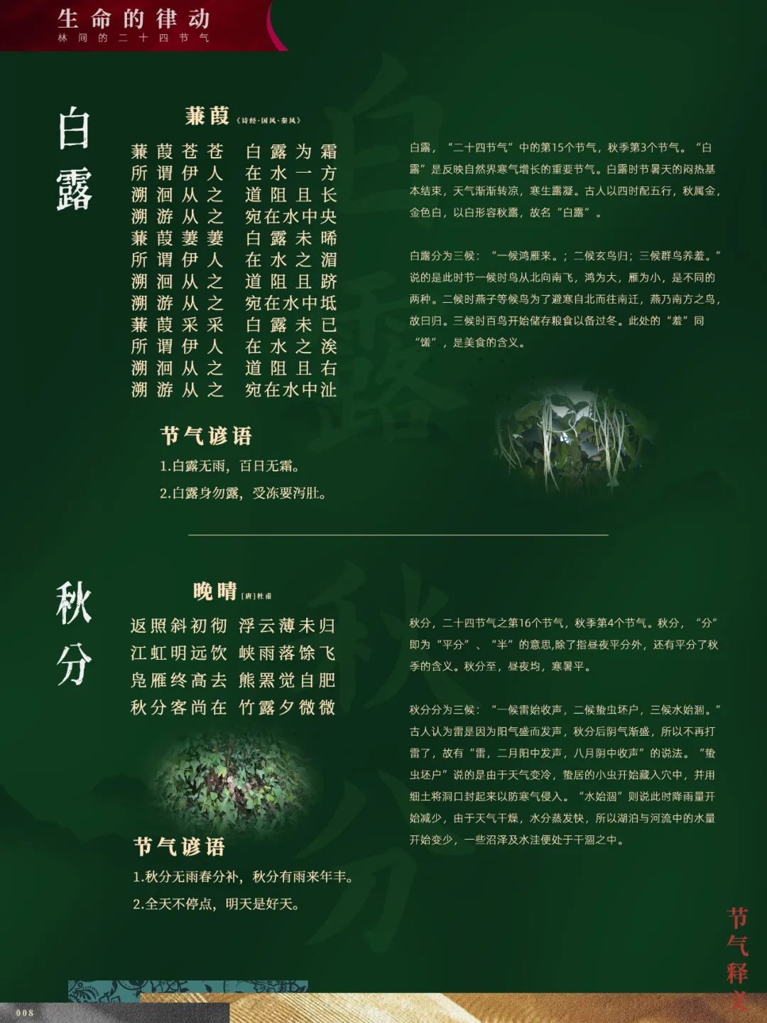 二十四节气是中国人诗意栖居的创造,是上古先民顺应农时,通过观察天体运行,认知一岁中时令、气候、物候等变化规律所形成的知识体系,蕴含着悠久的文化内涵和历史积淀,是中华民族悠久历史文化的重要组成部分。展览带我们亲近自然,从节气释义、节气森林、节气游戏等版块展现树木在二十四个节气中循环律动的过程,展现中国传统文化的智慧以及自然界勃勃的生命力。