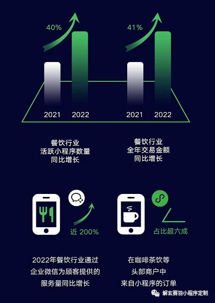 餐饮同样是受影响最严重的行业之一,服务好“回头客”,做好数字化,越来越成为餐饮行业的共识。2022年,餐饮行业更注重口碑服务与熟客运营,餐饮行业通过企业微信为顾客提供的服务量同比增长近200%。而餐饮商家通过小程序开展自营外卖的趋势愈发明显,在全国连锁top 100的餐饮商户中,目前已有近六成开通了小程序外卖。与此同时,随着众多餐饮商户加快数字化进程,活跃餐饮小程序数量同比增长40%,交易量同比增长41%。