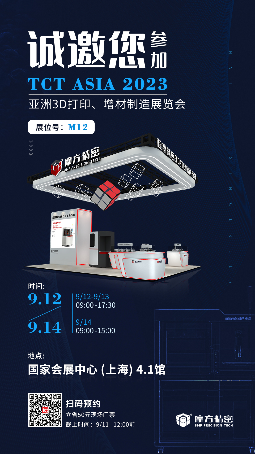 第九届TCT Asia再度启航,将于2023年9月12日-14日在上海国家会展中心4.1馆(虹桥)举办。届时,重庆摩方精密科技股份有限公司(以下简称:摩方精密)将携多款新设备、新终端、新材料及高精密3D打印解决方案重磅亮相M12展位,诚邀您与摩方精密一起亲临TCT Asia现场,感受这场3D打印与增材制造技术的革新盛会。
