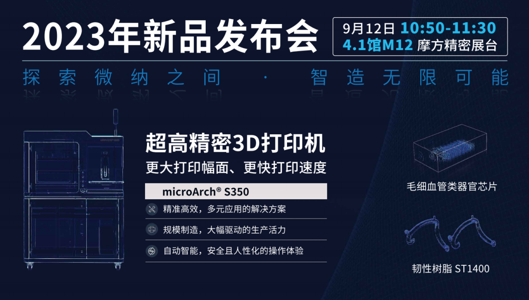 摩方精密作为高精密增材制造领域的领军企业,始终坚持原创技术牵引,创新驱动制造,深度链接新产业开发应用,不断探索精密制造新技术、新设备、新产品、新材料。摩方精密针对市场用户诉求,进一步推进高效率、规模化、多场景的生产制造,全新研发推出了多款产品,将于9月12日11:00在TCT Asia摩方精密展位现场(4.1馆M12)正式揭幕发布。