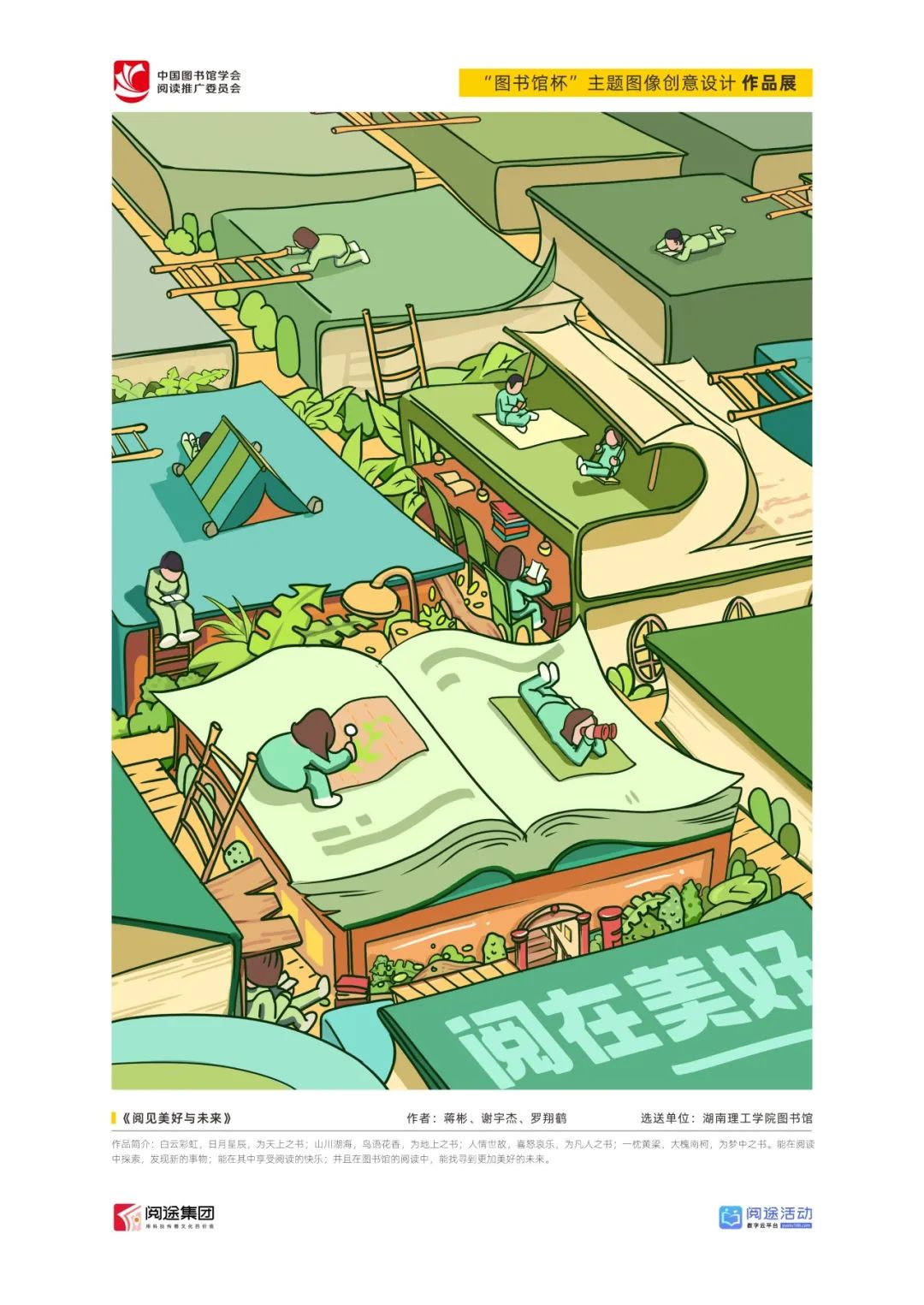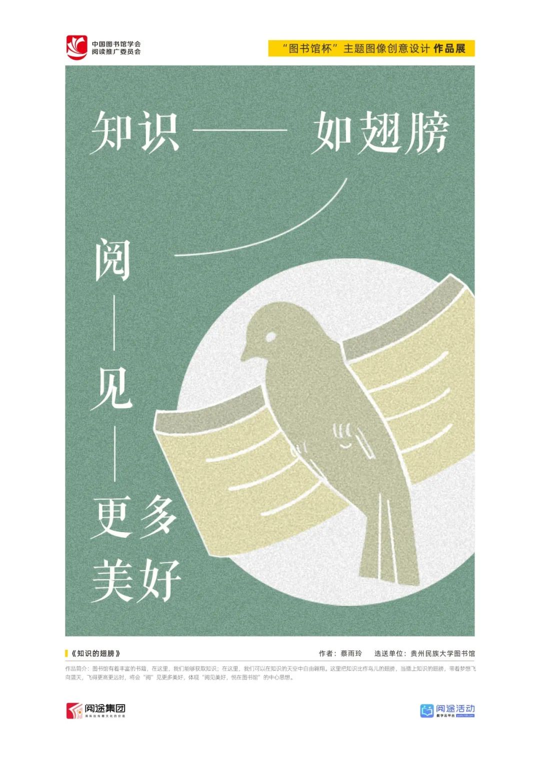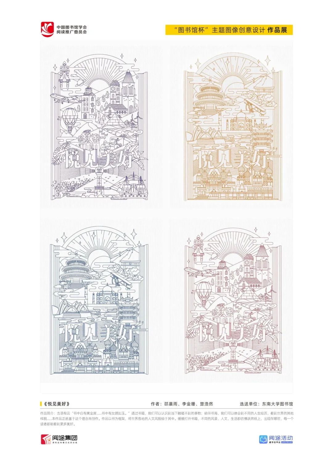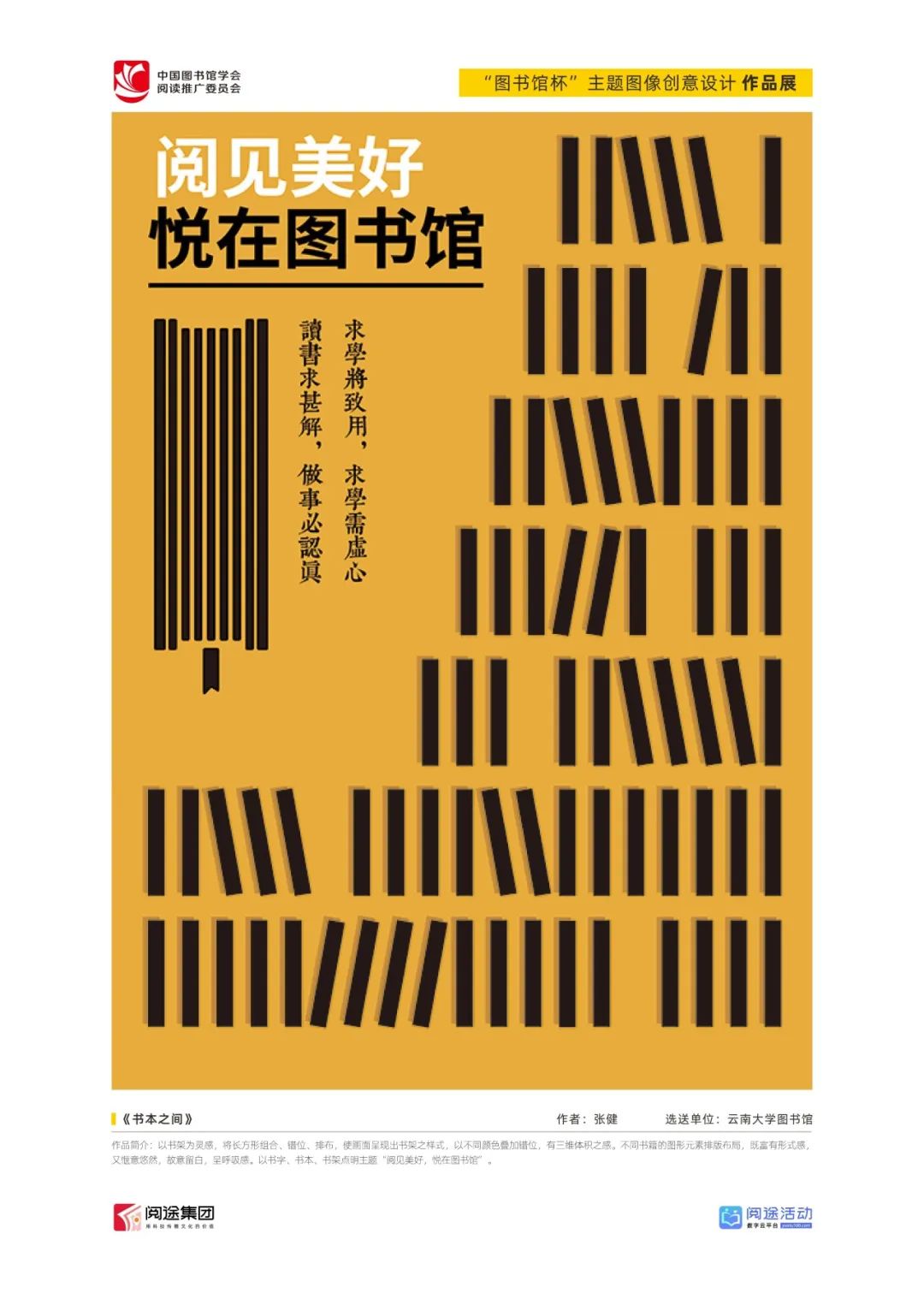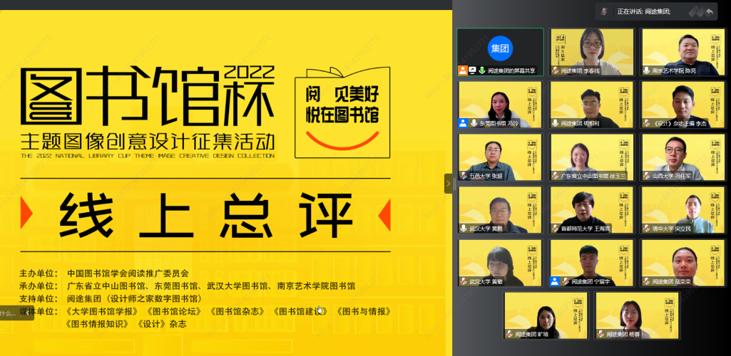 ★ 2022年,为深入贯彻落实习近平总书记给国家图书馆老专家回信精神,中国图书馆学会阅读推广委员会以“阅见美好,悦在图书馆”组织开展2022年“图书馆杯”主题图像创意设计征集活动,广东省立中山图书馆、东莞图书馆、武汉大学图书馆、南京艺术学院图书馆联合承办,阅途文化集团有限公司提供支持,通过“设计师之家数字图书馆”征集作品,获得社会各界积极反响。