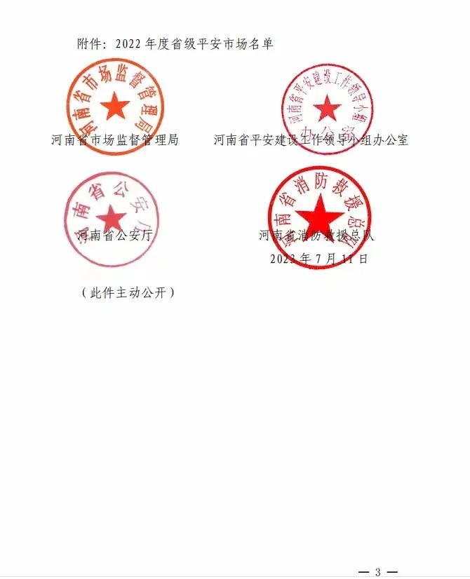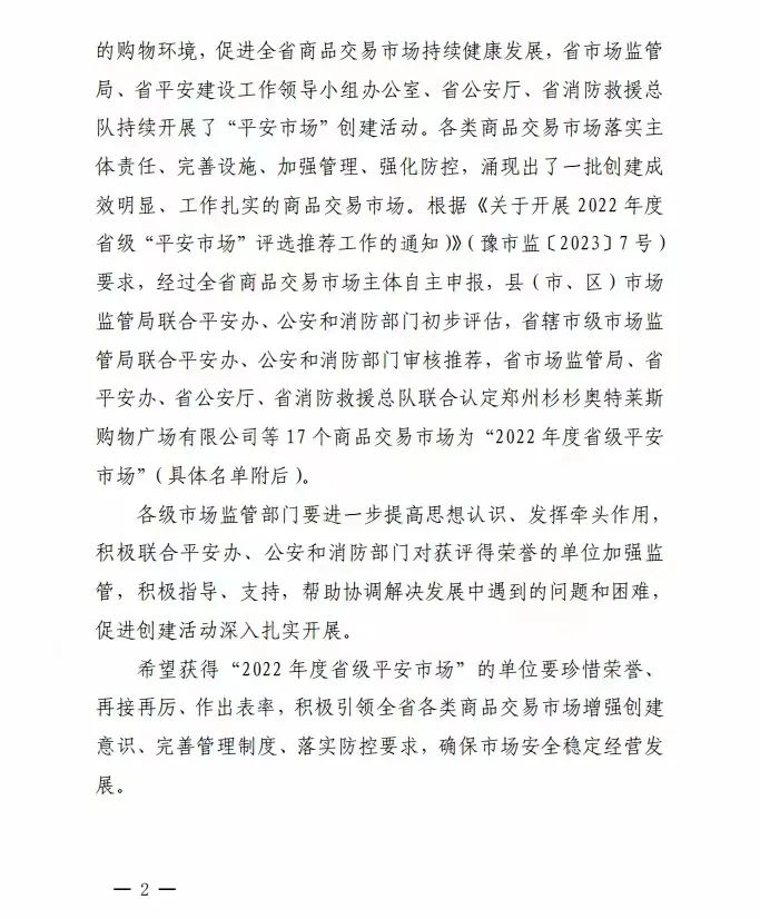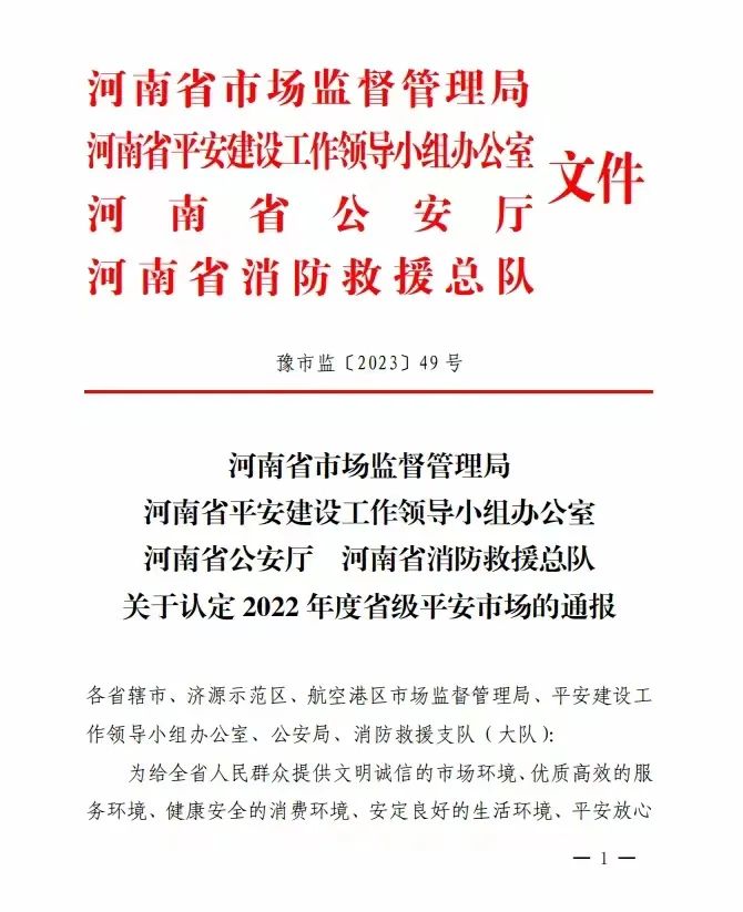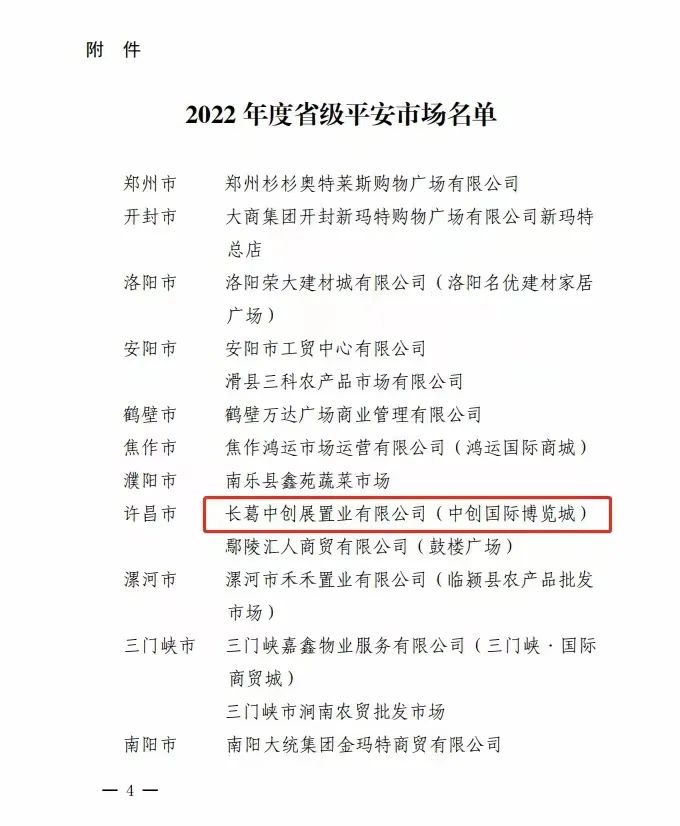 根据豫市监字【2023】49号文件(见附1),经河南省市场监管局、河南省平安建设工作领导小组办公室、河南省公安厅、河南省消防救援总队等五家单位联合评比,长葛中创置业有限公司的中创国际博览城取得了“2022年省级平安市场”的荣誉称号。