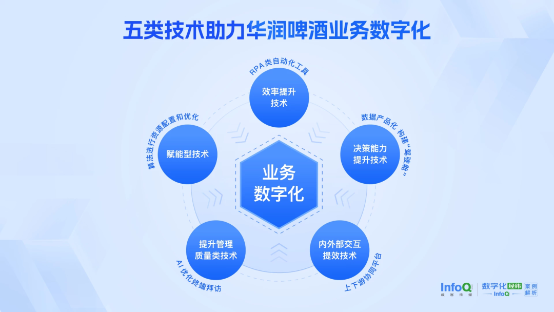第二类是 赋能型的技术。以供应链为例,通过应用算法来平衡现有需求和供应之间的关系,当前华润啤酒的供应链计划和仓网规划都运用了大量的计算逻辑和算法来进行资源配置和优化。郭华表示,这一类技术本质上是解决一些结构性难题,比如调整业务的分工合作、优化流程,以及在组织层面培养一些中心化的能力。