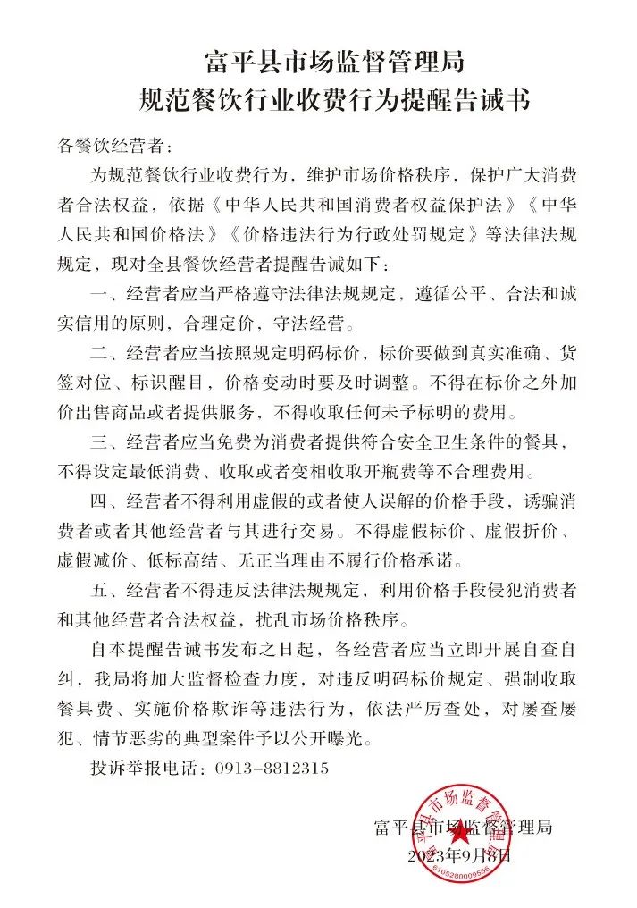 富平县市场监管局规范餐饮行业收费行为提醒告诫书