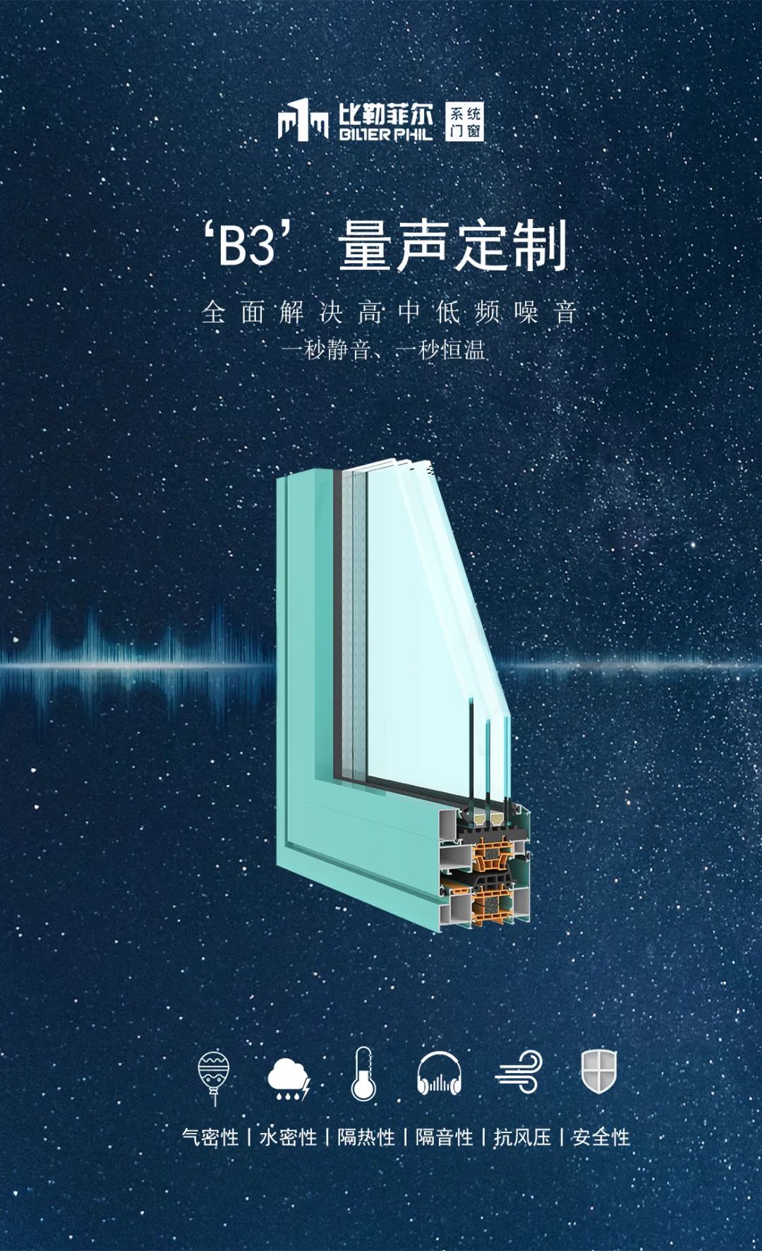 比勒菲尔B3隔声窗,利用不同厚度、不同材质、不同结构的玻璃和窗框,以及中间的空气层或胶层,通过改变声波的频率和振幅来阻断或衰减声波的传播,结构深度90mm,经多方检测,可隔绝44分贝噪声。