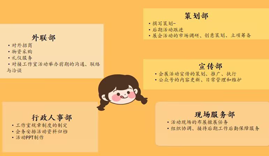 银杏文旅会展工作室成立于2018年10月,工作室成员全部由旅游系同学组成,主要承接校内外各项展览、会议、活动的策划、组织、服务、调研等工作。例如:工作室目前已经形成由策划部、宣传部、外联部、行政人事部和现场服务部五个部门构成的完整的组织架构。为了让各位小杏仁们更加了解我们,接下来小编会一一为大家介绍这五个部门的职责和工作。