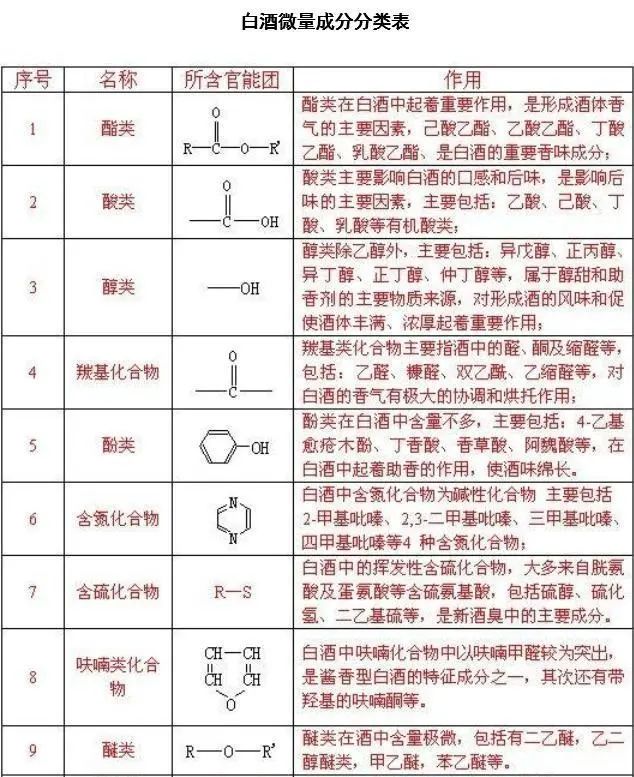 因为,酒的成分非常复杂,除了水之外,还有醇类、醛类、酯类、酚类、酸类、糖类、微量元素、金属离子……嗯,每种都还包含复杂的子类,这些物质共同构成了白酒的口感、风味,有的闻起来香,有的有酸味、甜味、苦味,有的使酒体变色,正因如此,中国白酒才分成了这么多香型和流派,白酒也因此而变得富有生命力和迷人。