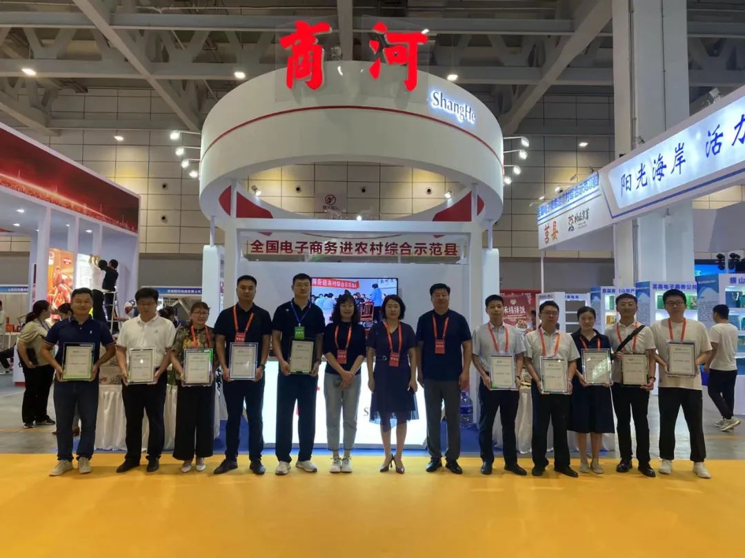 在商河展馆内商河县委常委、副县长王光芹,县商务服务中心党组书记、主任张东和县商务服务中心党组成员、副主任刘晶晶为商河县十佳电商镇、十佳电商村和十佳电商企业颁奖。