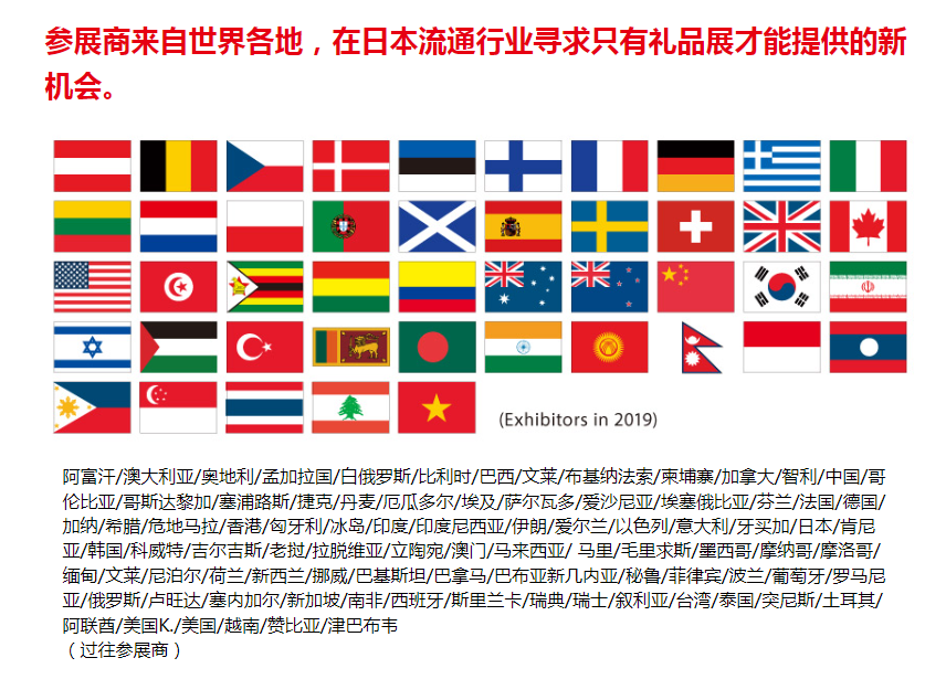 东京国际礼品、消费品博览会创办于1976年,每年分春秋两季举行,是目前日本国内最大、最重要的礼品及生活用品博览会。日本是一个非常重视交换及赠送礼品的国家,每年都会有许多人选择在圣诞节、母亲节、情人节及生日时向自己的亲朋好友赠送礼物,因此日本礼品市场拥有非常广阔的前景。83%的参展观众把东京礼品展看作是能够成功交易和搜集有价值市场信息的,最值得参观的贸易展览会。同时该展会也是外贸企业、工厂进入日本礼品市场的最好途径之一。