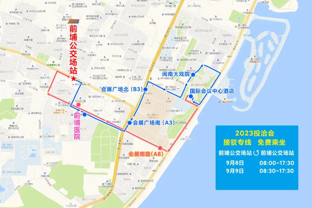 (二)停靠站点(单向停靠):前埔公交场站、前埔医院、会展广场南(A3)、会展广场北(B3)、闽南大戏院、国际会议中心酒店、会展南路(A8)、前埔医院、前埔公交场站。