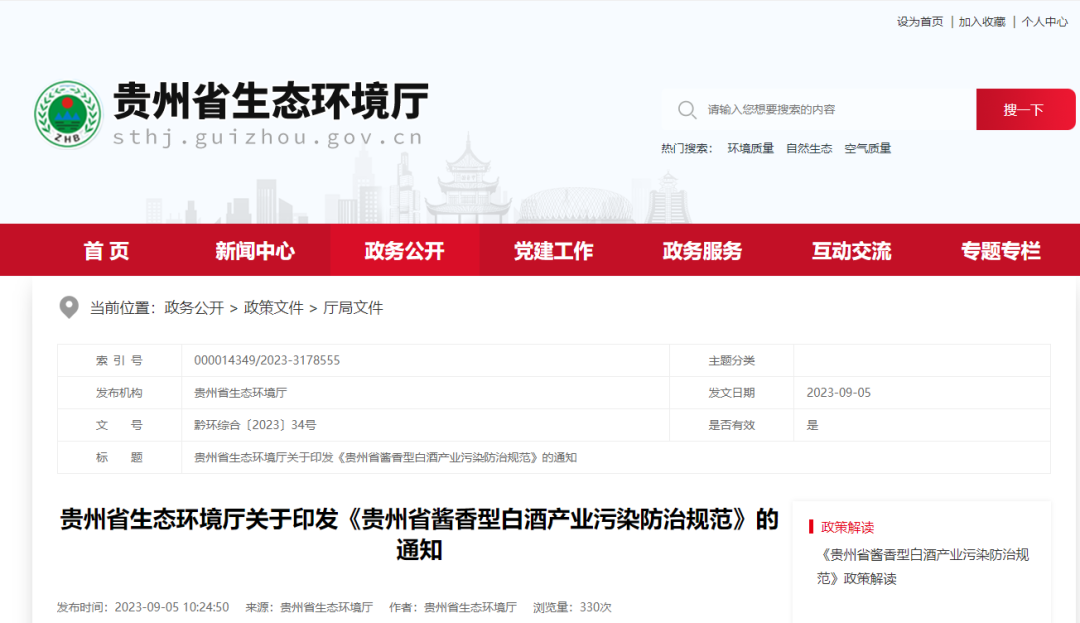 贵州省生态环境厅关于印发《贵州省酱香型白酒产业污染防治规范》的通知