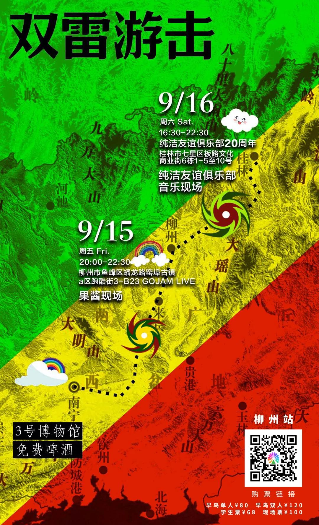 9月中旬秋色正浓、气候舒爽,适合出行会友。本次演出由南宁本土两支reggae(雷击/雷鬼)风格乐队:3号博物馆、免费啤酒合体(共享鼓手)联合出击,以演带游,会友劈酒之行。