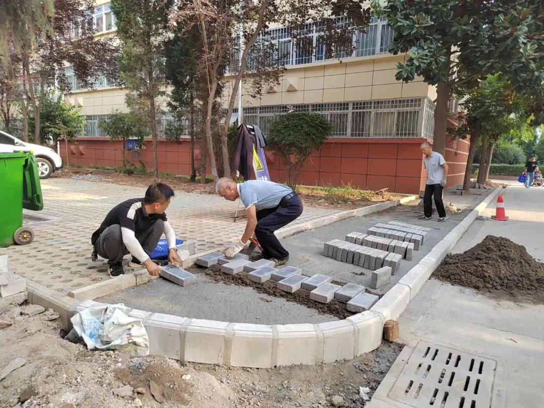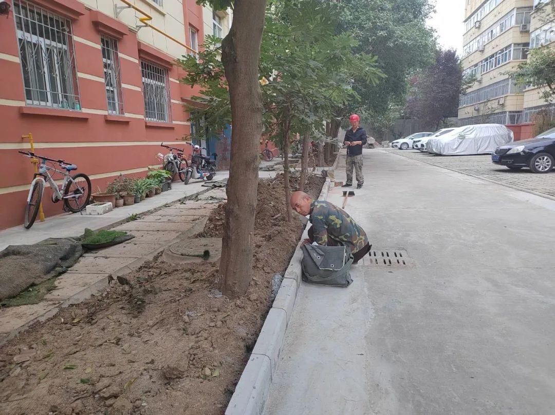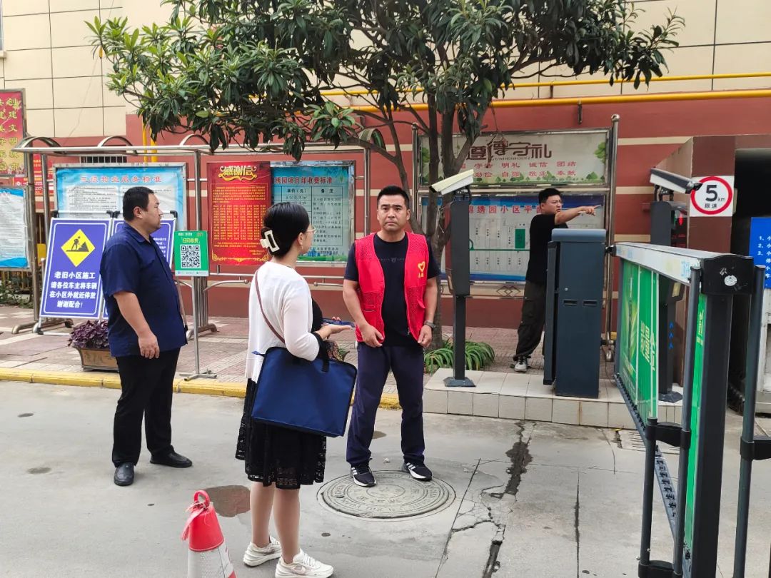 9月6日上午,社区工作人员巡查锦绣园老旧小区改造进度。