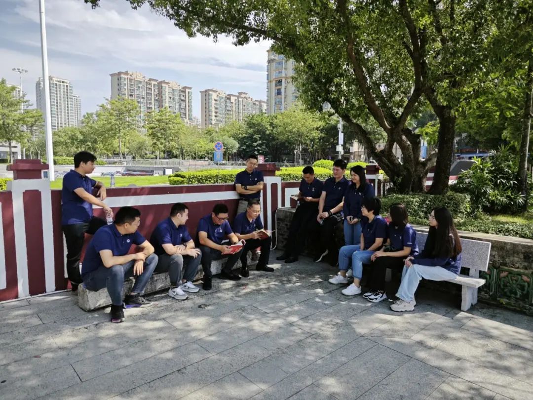 杨匏安纪念馆门外绿树成荫,海洋公司党支部书记吴文中领读了《百年初心成大道》的篇章。