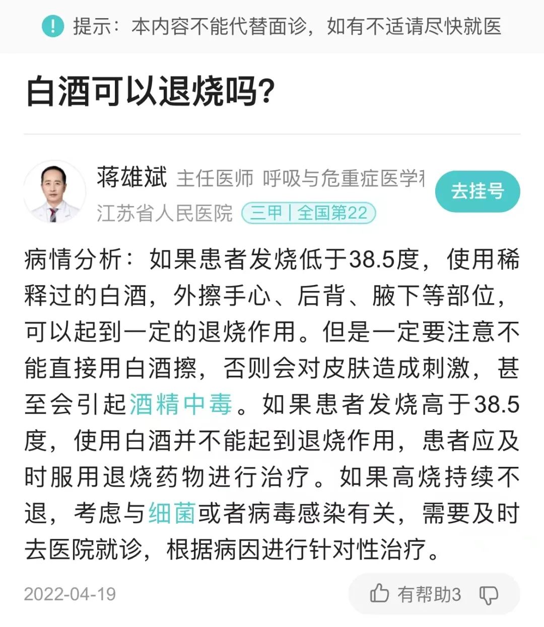 所以,一旦发烧之后,要密切监测体温,如果体温在37.5~38.5度的话,可以使用家里的白酒来进行物理降温。