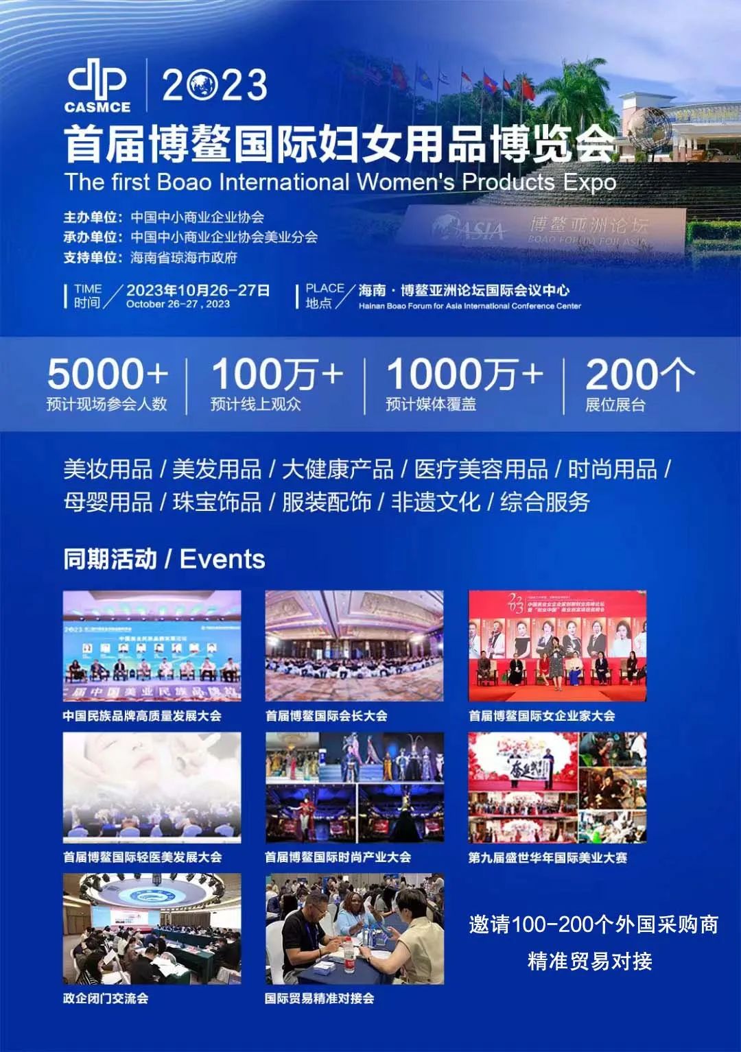 首届博鳌国际妇女用品博览会将于2023年10月26-27日在海南博鳌亚洲论坛会址正式举办,特别邀请100-200家外国采购商,与中国优秀民族品牌进行精准对接,为国内外企业搭建一个全面、专业、开放、高效的长期对外合作洽谈平台。