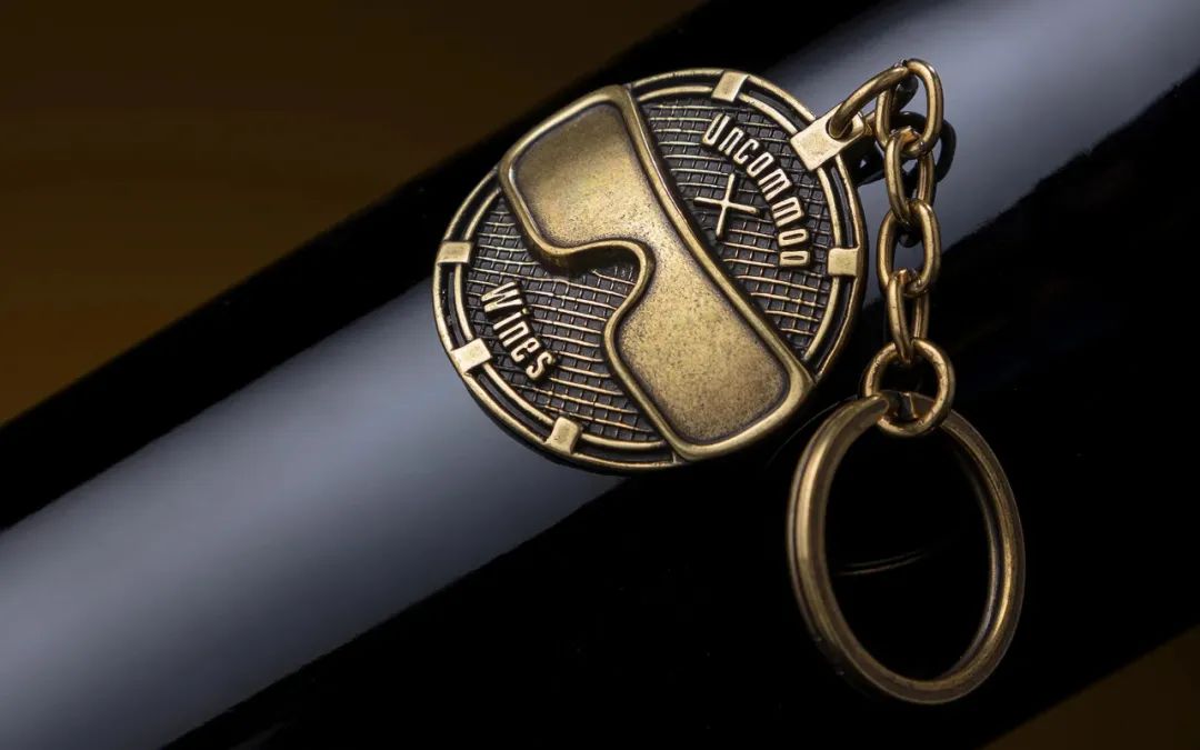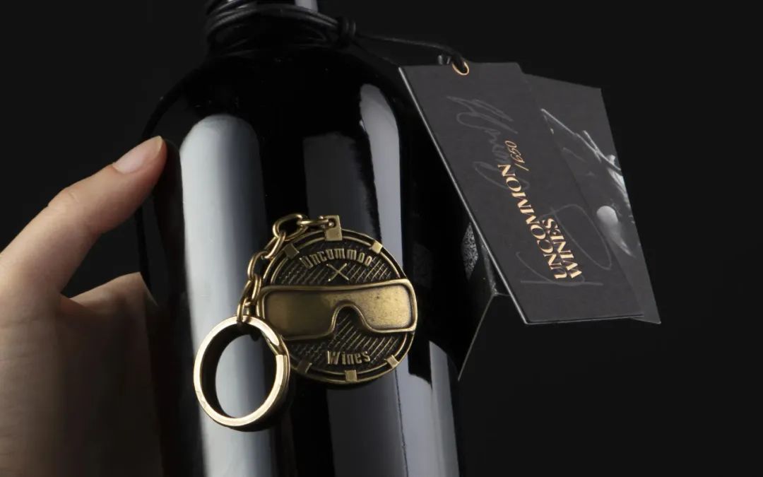 酒瓶颈上的标签向我们讲述了他的故事,他对生活的热情和对非凡葡萄酒的制作;幸运的主人喝完酒后,钥匙链就可以挂在奖章上。