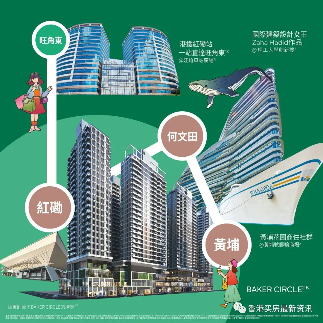 南九龙全新发展规划蓝图MIDTOWN SOUTH横跨九龙市区如红磡、尖沙咀、何文田,以至旺角等多个核心地段,BAKER CIRCLE GREENWICH尽享市区交通枢纽网络地利,无缝连接港九多个核心地段,以至北部都会区。由项目出发,信步即达区内多个铁路站,受惠于沙中线开通,经由红磡站乘搭东铁线一站过海直达会展站,两站到金钟,乘搭屯马线则可前往另一都会核心尖东,两站即达柯士甸,为使用高铁往返内地的住户带来便利,轻松实践大湾区一小时生活圈。