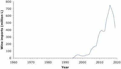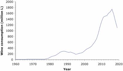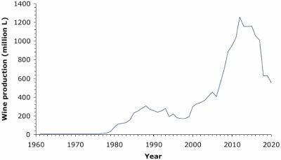 事实上,中国的葡萄酒生产按年收入增长(%)计算