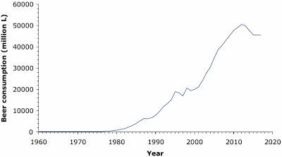 当然,抛开中国酒精消费以白酒和啤酒为主的事实来谈市场是不负责任的。我们还是可以清晰的感受到啤酒在消费量上的统治地位。