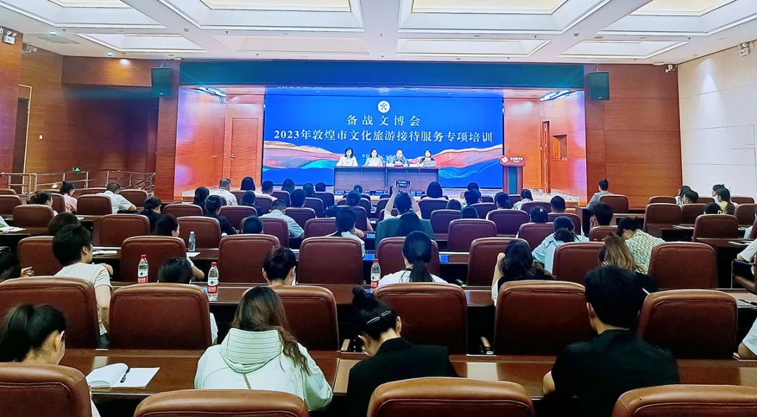 制定下发《文博会期间做好接待服务的通知》、发放“文博会”接待服务倡议书,与服务人员签订承诺书,引导服务人员热情、周到服务。培训邀请高级商务礼仪专家、国家认证形象管理师魏宁宁及国家高级导游员、文化和旅游部“万名英才计划”劳模大师工作室项目承担人、国家文化和旅游部“名导进课堂”师资库成员云春雷分别为敦煌市文旅系统干部职工、文博会服务导游、重点酒店旅游接待服务人员、重点景区讲解员近200人进行《敦煌历史文化及接待讲解服务》、《文明礼仪及政务接待服务规范》等内容专题培训,并进行实训演练。各景区精准“把脉”服务质量,从内强素质、外树形象上着手,组织一线服务人员练形体、练礼仪,全面提高服务岗位人员的综合素质。文博会期间,包含中、英、日、法等115名导游,各景区近100名讲解员统一着装、统一标准,以最佳的状态最热情周到的服务参与接待工作,获得了参会嘉宾的一致好评,展示了文旅人良好的精神风貌和敦煌国际旅游名城的形象。