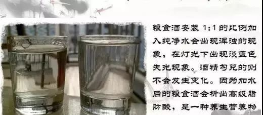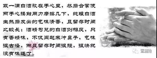 将白酒倒入酒杯后(酱香酒的酒色透明或微黄),轻轻的将酒杯晃动一下看酒液流动的速度,其速度比水流动的速度要慢,其原因是白酒中含有多种微量元素,这些元素会直接影响到白酒酒体的稠度和丰富度。酒液在手指间您能感觉到丝滑中带涩与拈动热巧克力的感觉相似为好酒,为什么这样说呢?是因为酒分子里面有一层酯化物薄膜富含的酯类物质与水分子,在酒中长期的互相交融(原载于《中国白酒》)渗透形成的,所以酒体才会有丝滑带涩的感觉。倒入干净酒杯,张力十足,可溢出酒杯一成。为什么会这样呢?好酒中有以健康金属因子硒、锌、铁为中心形成的络合体,络合体使酒体结构张力十足。酒滴在纸巾上,酒液略缓慢地均匀晕开,周边浅的水迹很小。酒液缓慢晕开是好酒的一个明显的标志。酒精和水的比重不同,散开的速度也不同。而酒液经过长期密封、发酵后,酒曲的先天发酵作用开始充分显现,酒曲的核心因子,直接决定了酒水和酯化物的融合度。越是好酒,融合度越高,酒液和水融合完美,周边水迹就会很小。将白酒倒入手掌中双手搓干再轻嗅粮香和扑鼻的糟香,这一辩认方法简单快捷。这样做是因为白酒在形成风味质量前,要经过严格工艺处理,如果白酒中出现邪杂味、糠味、窖泥臭和霉味等就是人为疏忽导致的为劣质酒,白酒能保持粮食原有风味是优质白酒的象征。品酒的过程中,好酒具有入口柔和、香气饱满、醇香馥郁、回味悠长等特点。真正的好酒丰富的香气缓缓飘进鼻腔,最开始闻时有饭、粮香及复合陈年老酒香气,这种香气让人有馨香飘逸的感觉。在您品酒的过程中如果遇上真正的好酒,2小时后虽有微醺但不上头,没有口干的感觉,没有一点酒气酒臭味,小便也无异味。白酒中富含酯类和醛类物质,这些物质使好的白酒酒体具有融油性的特点,如果您想测评一款酒的好坏时您可以在酒中滴一滴食用油,如果食用酒在酒中能自然均匀扩散和下沉则为好酒。将酒瓶倒置就能见到分布均匀的酒花,上翻时密度间隙明显酒液清澈且酒花缓慢消失。酒花与酒精度高低和乙酸乙酯(原载于《中国白酒》)物质比例相关,比例不同使酒花呈现的形态也不同,优质好酒的特点是酒花细密,次之的白酒酒花粗疏。把酒瓶倒过来摇晃,观察酒花变化,酒花密集且消失缓慢的是优质酒,酒花少消失较快的则为劣质酒。将盛过酒的杯子静置一夜,第二天去闻杯子,如果是好酒依然会有浓郁的酒味,如果是差酒,估计已经没有味道了,空杯留香并不是酱香型白酒的“特权”,粮食酒普遍都可以。举个例子,如果媳妇回家闻着你呼气臭哄哄的,那说明酒的质量不好,要是吃臭豆腐喝酒,有口臭的除外。把酒倒一小半在杯子里,然后加入一部分纯净水,酒会变浑浊,摇一摇酒杯,酒精与水完全互溶,白酒里面的酯在酒杯中呈现出胶体状,酒杯变浑浊依然透明,可以保持相当长的时间。酒桌之上,酒中莫掺水,以免被人发现产生尴尬。如果掺水之后,并不浑浊,除非是纯酒精的伏特加,否则就是很一般的白酒。GB\T10781-2006是固态法白酒的执行标准,是采用纯粹粮食为原料,用曲经固态发酵生产的酒,也就是老百姓常说的好酒。GB\T20822-2007是固液结合法白酒的执行标准。即白酒中有一部分是酒精酒,一部分是粮食酒。GB\T20821-2007是纯酒精酒的执行标准。新标准是强制性规范,能帮助消费者辨别不同工艺的白酒,避免大量生产勾兑酒的中小酒厂以劣充优。今后,消费者可以从执行标准上判断出您所喝的酒是粮食酒,还是酒精酒。如果您发现酒的执行标准是粮食酒的执行标准,而瓶中的装的却是酒精酒,您就可以以侵犯消费者知情权起诉厂家。用氢氧化钠,即大家常说的烧碱,把要检测的白酒2两加入烧碱2克放入试管,然后放入热水中加热十分钟,好的白酒会显示为黄色,但是勾兑的劣质白酒完全不会变色。鉴别原理:优质白酒为粮食酿造,劣质的白酒是工业酒精勾兑香料,不会起化学反应。往杯里倒入少量酒,再滴入几滴茶水。真酒颜色会变成淡黄色,假酒会立即变成紫黑色。对于高度白酒,可在茶杯中倒入半杯白酒,加上少许冷水后振摇几下,使其混合(原载于《中国白酒》)均匀,如果见杯中水变混,表明是用粮食为原料制成的酿造白酒,若仍是清澈透明的则可认定是用酒精兑制的。对于低于30度的酿造白酒,用上述方法摇匀后虽不能见到明显的混浊,但其液面上会飘有油状物,而兑制白酒则无。因此可据此鉴别酿造白酒和兑制白酒。冷藏法:根据脂类物理特性,1°C以下结晶、凝固。原浆酒里,含有脂类物质,在1°C以下时,会结晶、凝固。用玻璃瓶装酒,放到冰箱冷冻时,半天就有凝结现象,放到冷藏室需要3天。就是说当酒液低于1°C时,会有许多絮状物质出现,然后加热,絮状物质消失,这是脂类物质析出。勾兑酒,就不会有此现象。