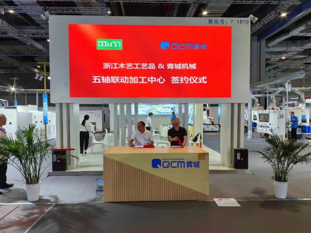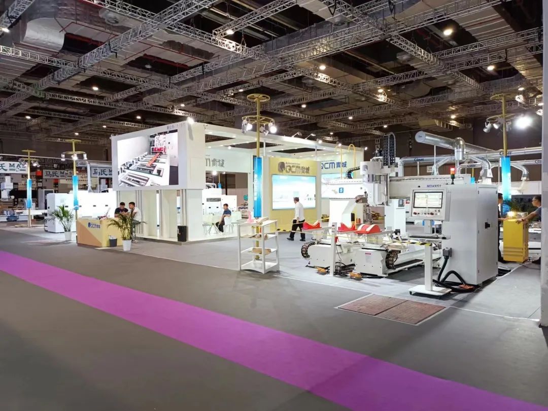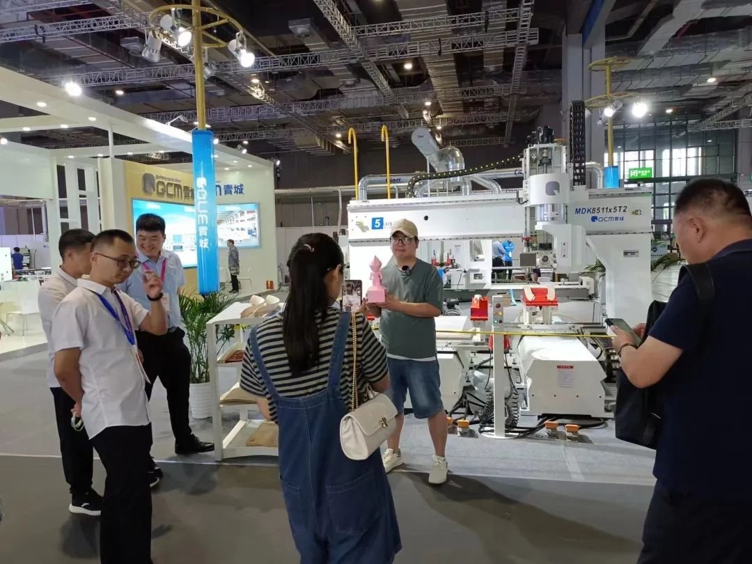 青城机械展台熠熠生辉,展会现场气氛热烈,青城机械作为国内外知名的实木加工技术及装备供应商,展示了刨锯联合机系列、数控横截锯+高速四面刨系列、智能视觉+纵向优选系列、三脊卡扣双端开榫系列、数控榫卯加工中心系列、五轴联动加工中心系列等产品。