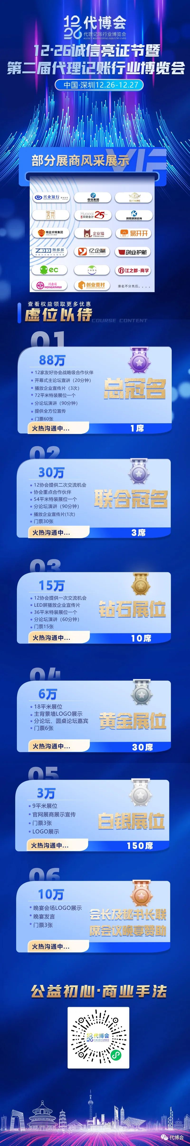 2023年12月26日-27日,“12·26”诚信亮证节暨第二届代理记账行业博览会将在深圳会展中心(福田馆)举行。本次活动云集行业大咖,超强阵容齐亮相,让您一览代账行业风采,聚焦行业领军人物,是属于代账人自己的盛会!现场更有一手资源对接,大力促进社会经济发展、行业标准合规、行业分享交流,创造跨界合作共赢机遇。