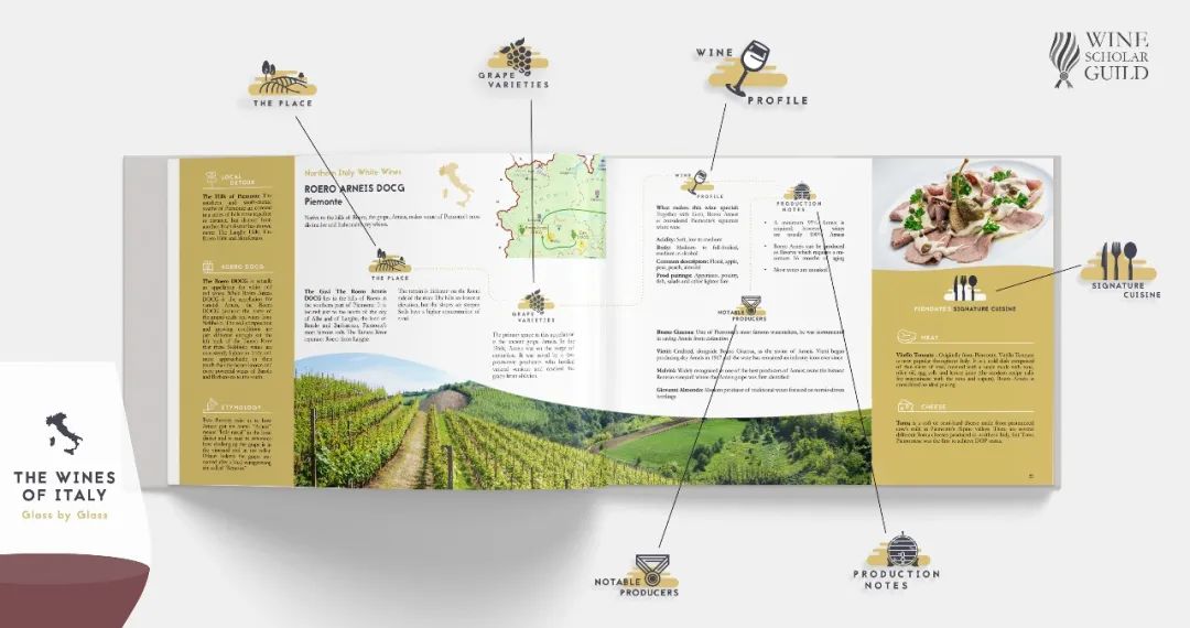 本课程将带着同学们以葡萄酒为主题“畅游”整个意大利。125页全彩色书本涵盖与意大利有关具有代表性的葡萄酒、美食、地标和文化景点等信息,其中包含多姿多彩的照片和地图。教材主要分为3个部分(按区域划分):意大利北部、意大利中部和意大利南部。