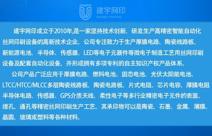厚膜印刷技术作为制作传感器(?可点击查看)的关键工艺,在印刷介质层、导体层、包封保护层中发挥着重要作用。建宇网印深耕厚膜印刷领域十三年,研发生产的多款高精密厚膜印刷机在传感器行业得到广泛应用。欢迎各位新、老客户莅临展会深入交流,加强合作。