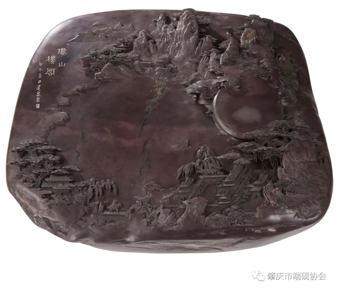 在古代有很多神仙传说,他们居住在奇异的灵山或遥远的海岛,景色优美,山形秀丽,生长着参天古树和各种奇花异草,更有造型精美的亭台楼阁散布其间。这些传说往往都是古人对美好生活的愿望和向往。此砚即以传说中的仙境为题材来设计构图。砚石为端溪三大名坑之一的麻子坑石材。作者依随砚石的自然形态,在中间开辟砚堂,展现出优良的石质,以及鱼脑冻、蕉叶白、胭脂晕等石品花纹。砚堂比喻湖泊,周围用高浮雕和浅浮雕相结合的技法,刻画耸立的群山,古树掩映下的亭台楼阁。左上角镌刻“仙山楼阁”四字点明题旨。由于雕工精细,意旨高远,观之如传世名画,具有很强的艺术感染力。